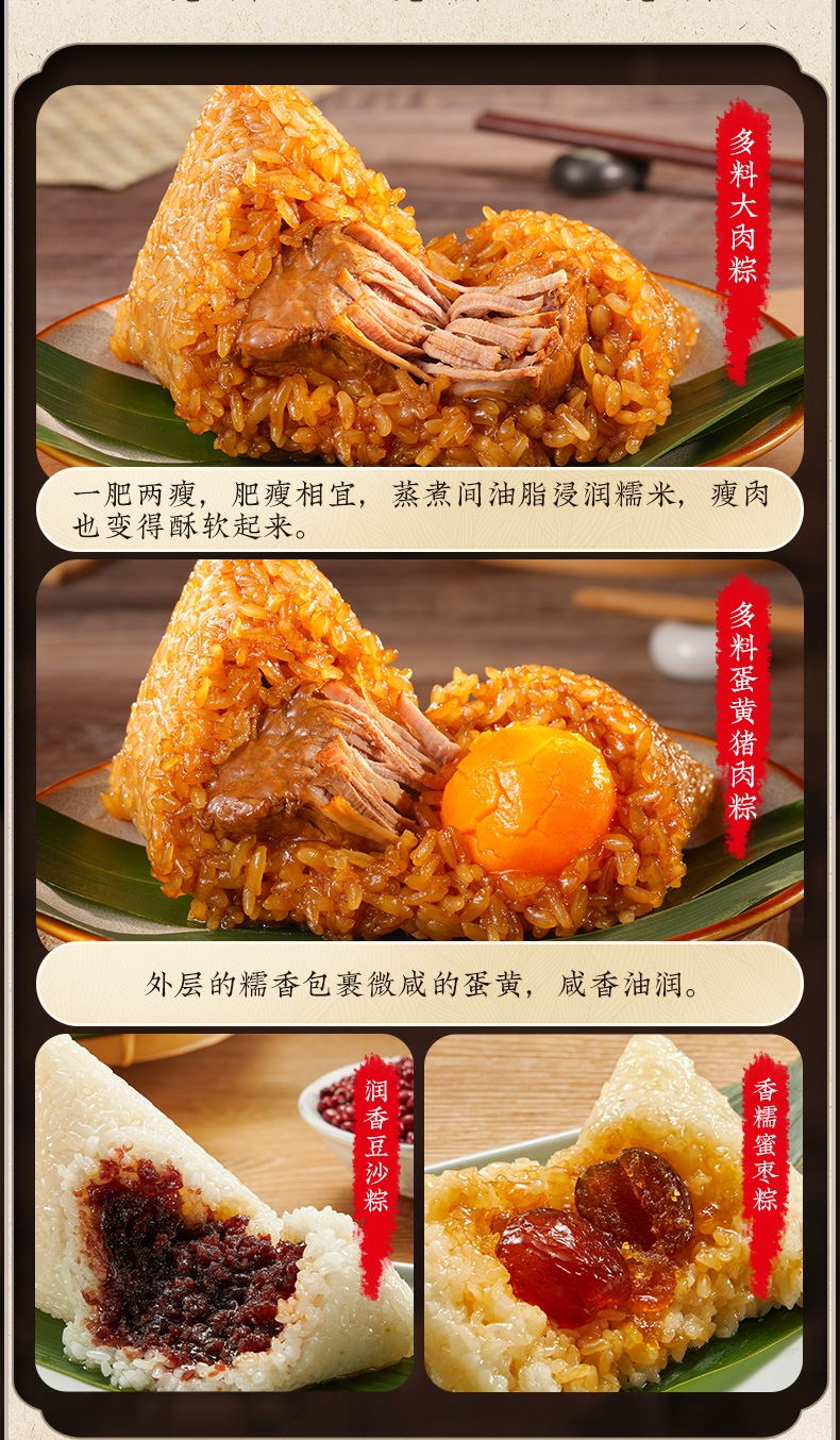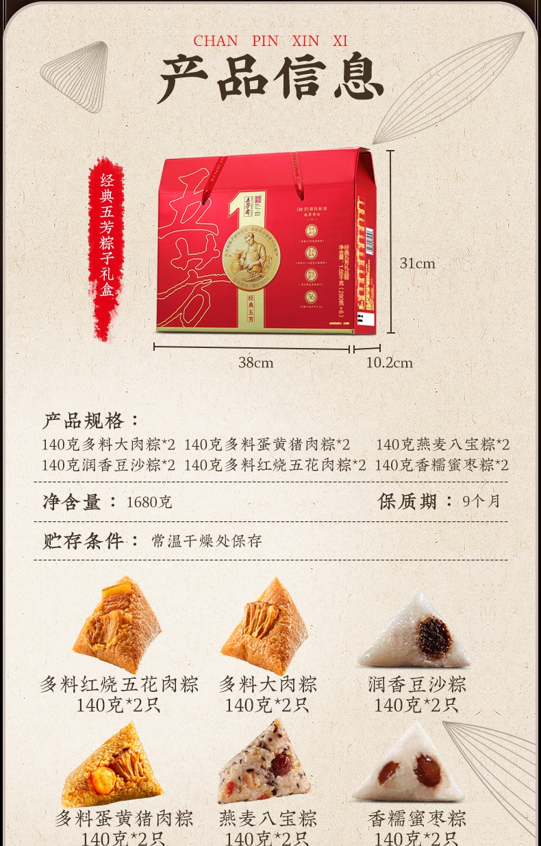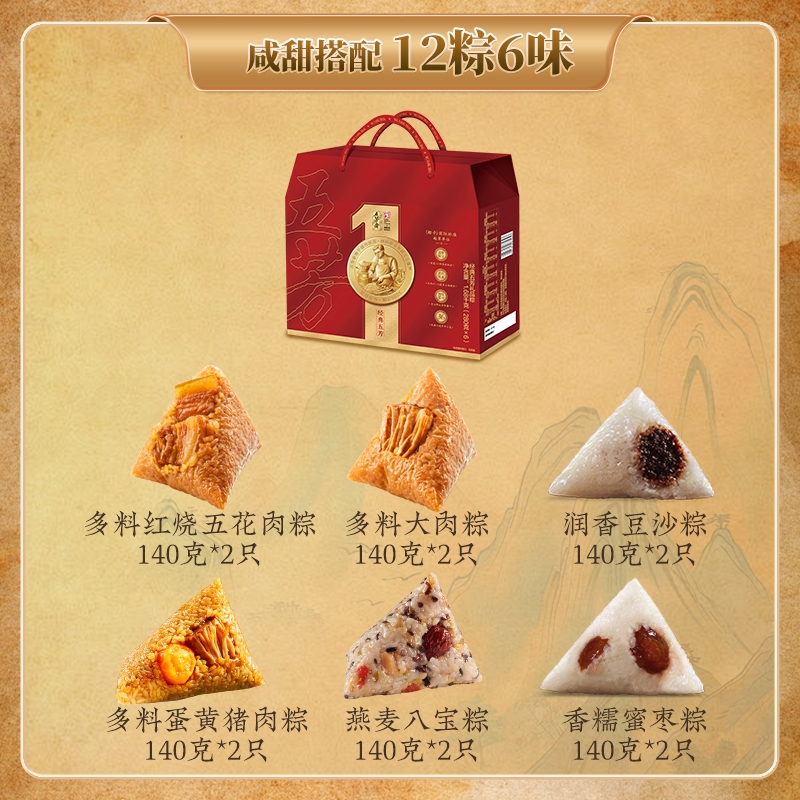 配置:多料大肉粽140g*2/袋*1 多料蛋黄猪肉粽140g*2/袋*1 多料红烧五花肉粽140g*2/袋*1 润香豆沙粽140g*2/袋*1 香糯蜜枣粽140g*2/袋*1 燕麦八宝粽140g*2/袋*1
