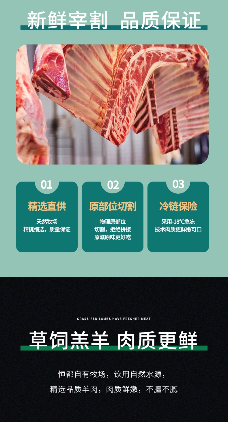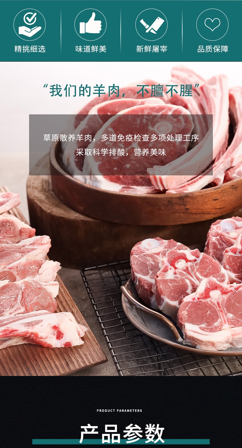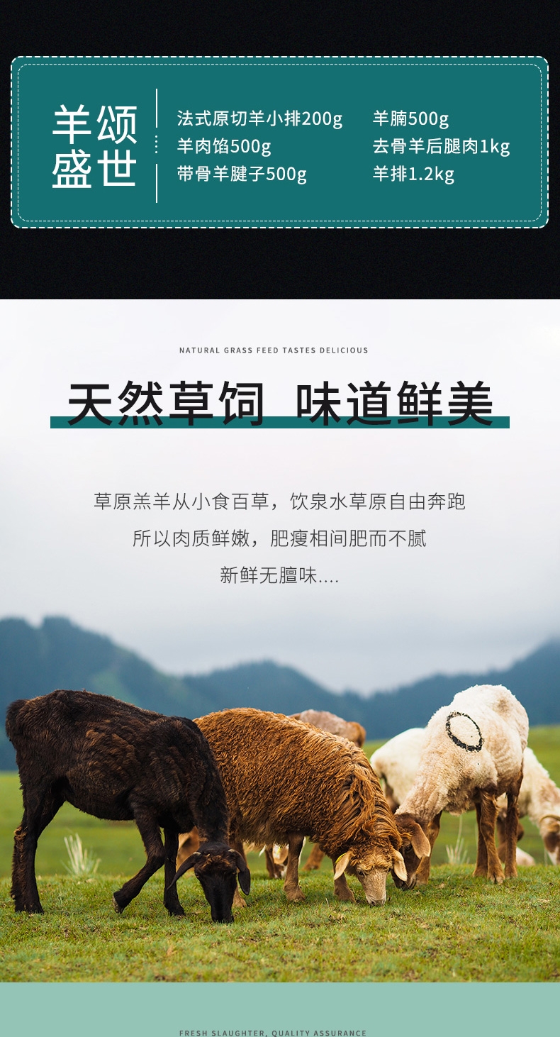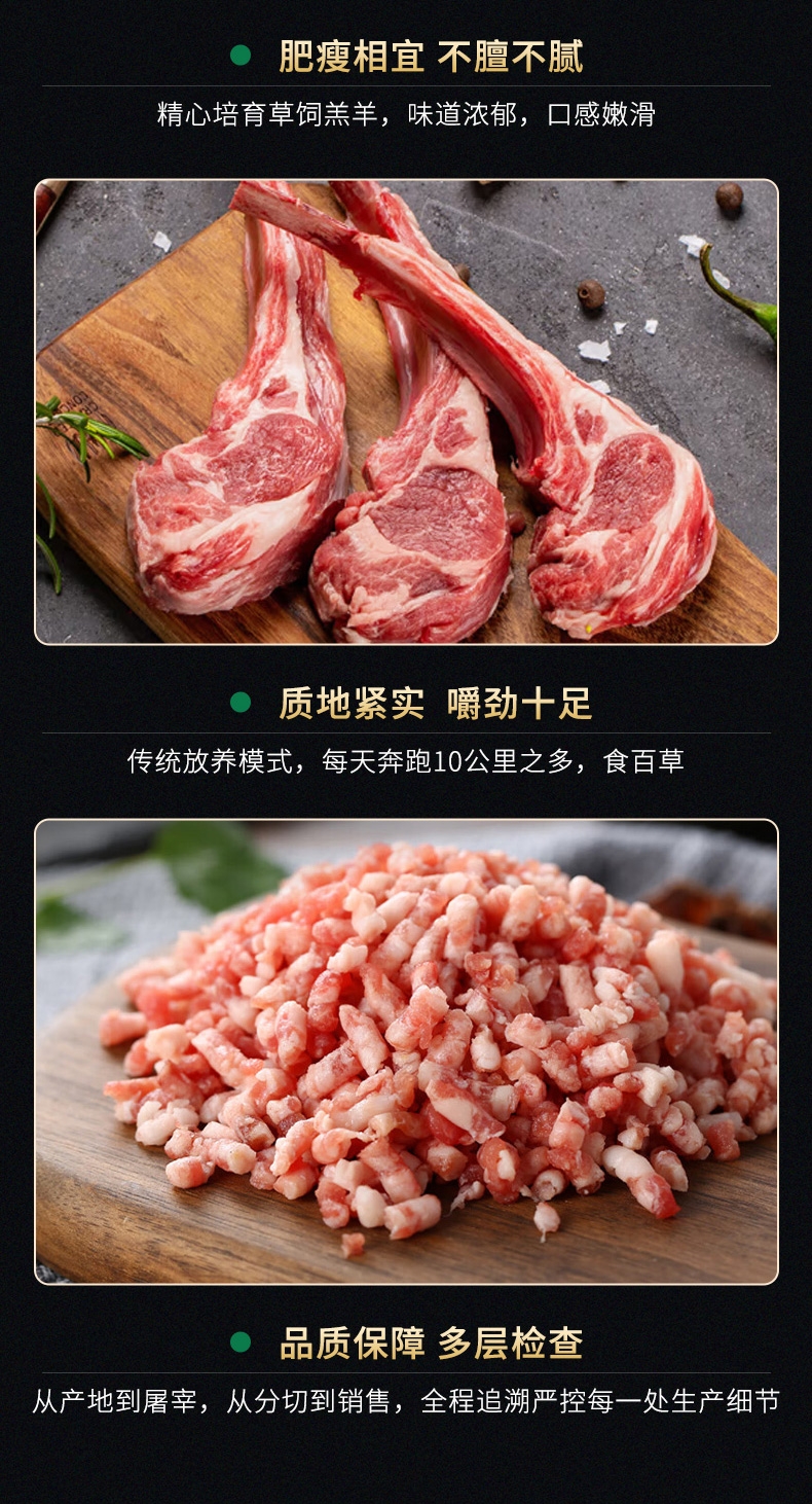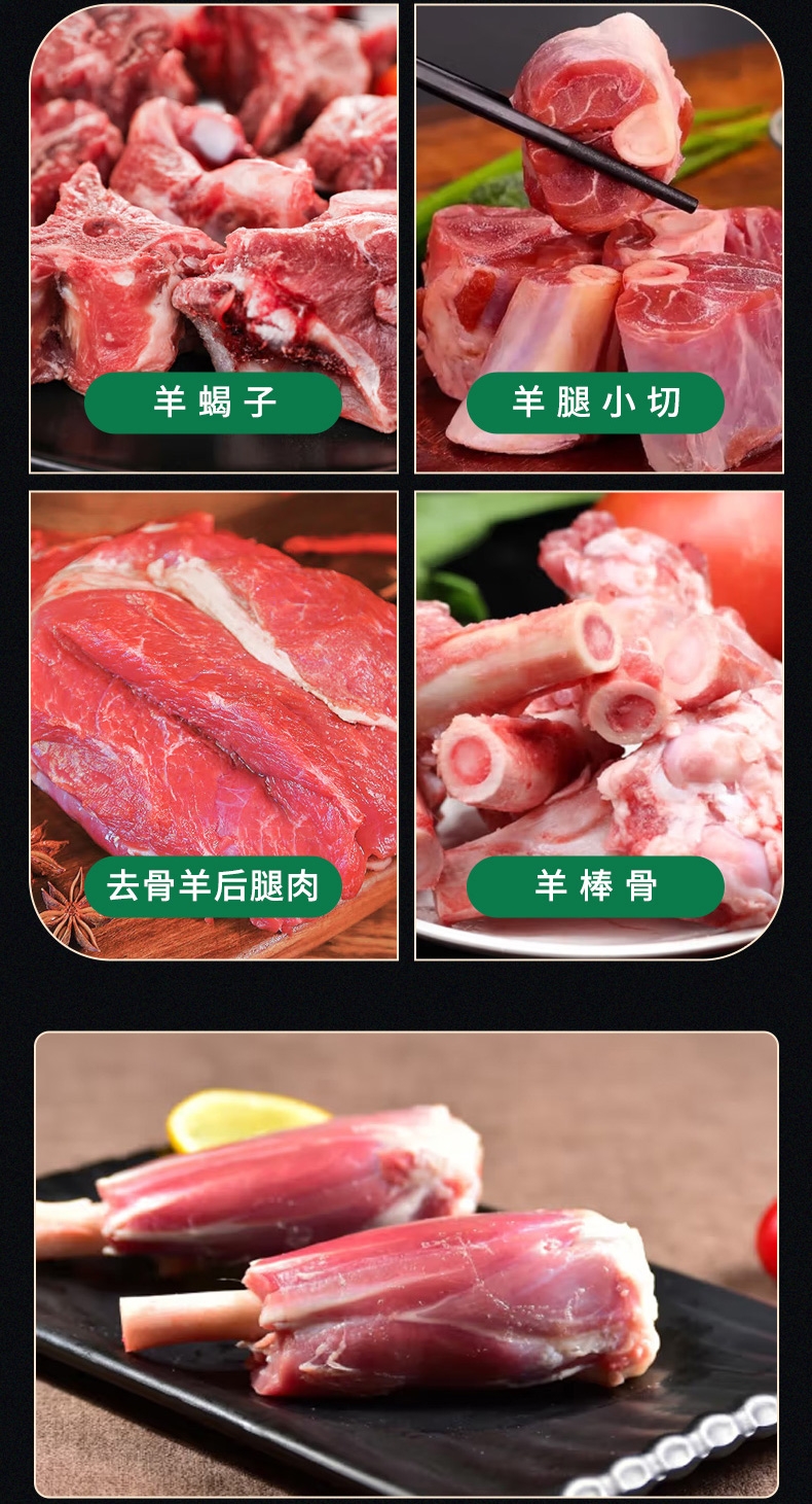 配置:法式原切羊小排200g 羊肉馅500g 带骨羊腱子500g 羊腩500g 去骨羊后腿肉1kg 羊排1.2kg