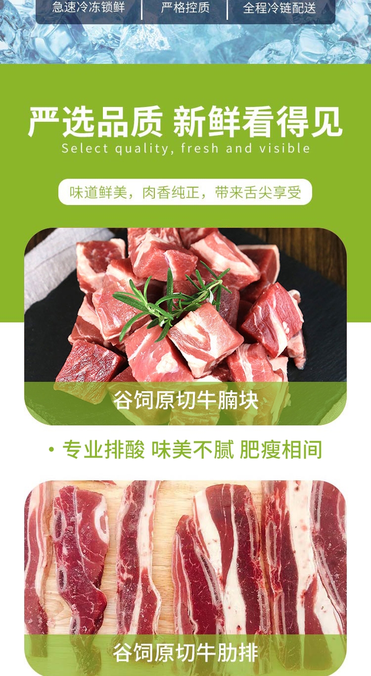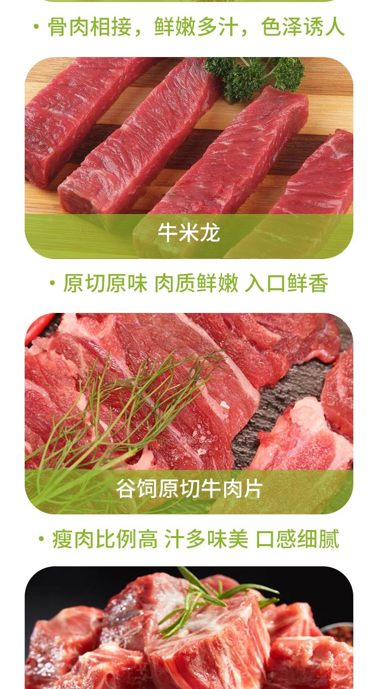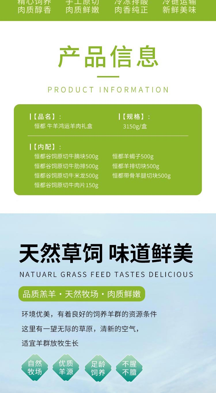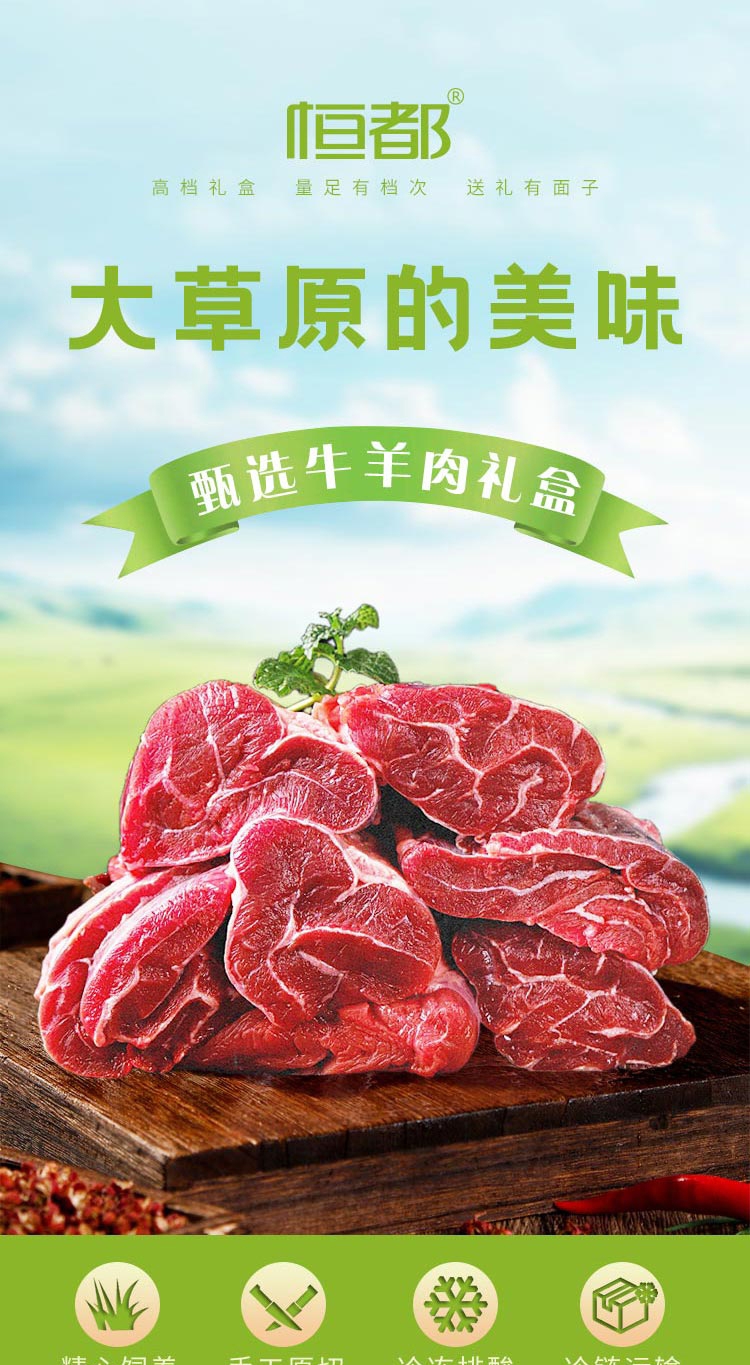 配置:恒都谷饲原切牛腩块500g 恒都谷饲原切牛肋排500g 恒都谷饲原切牛米龙500g 恒都羊蝎子500g 恒都羊排切块500g 恒都带骨羊腿切块500g 恒都谷饲原切牛肉片150g