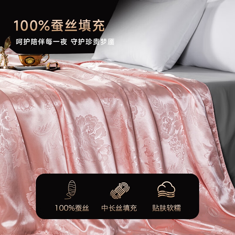优选高密度锻贡提花面料制作,精美提花彰显品味与档次;甄选100%柞蚕丝中长丝填充,呵护陪伴每一夜;新一代活性印染工艺,颜色靓丽,不易起球,不易褪色