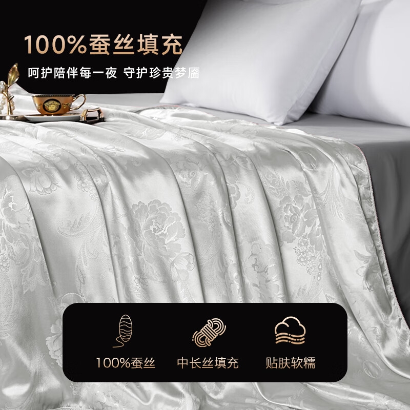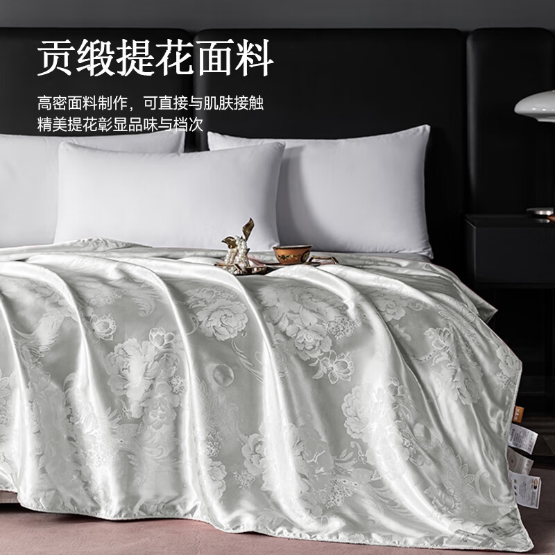 优选高密度锻贡提花面料制作,精美提花彰显品味与档次;甄选100%柞蚕丝中长丝填充,呵护陪伴每一夜;新一代活性印染工艺,颜色靓丽,不易起球,不易褪色