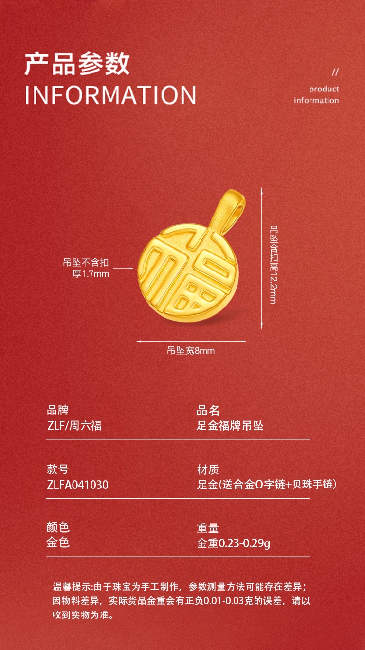 周六福 足金福牌吊坠ZLFA041030