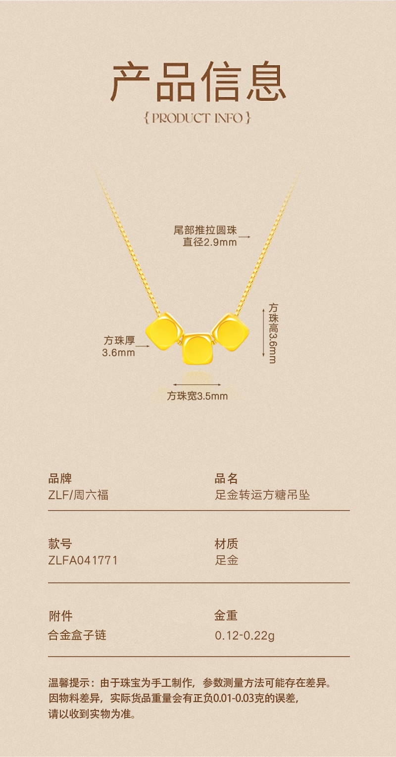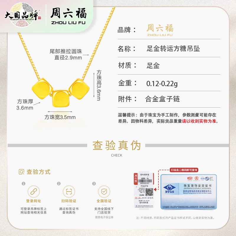周六福 足金转运方糖吊坠ZLFA041771