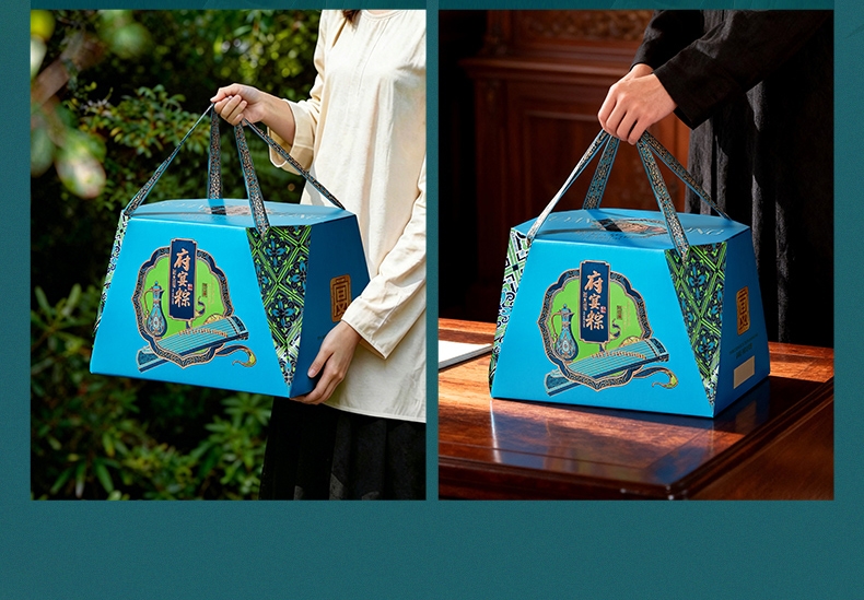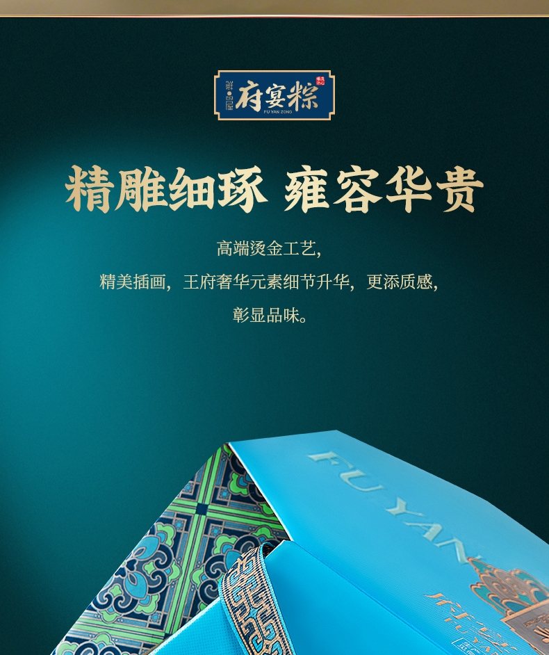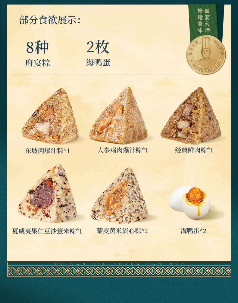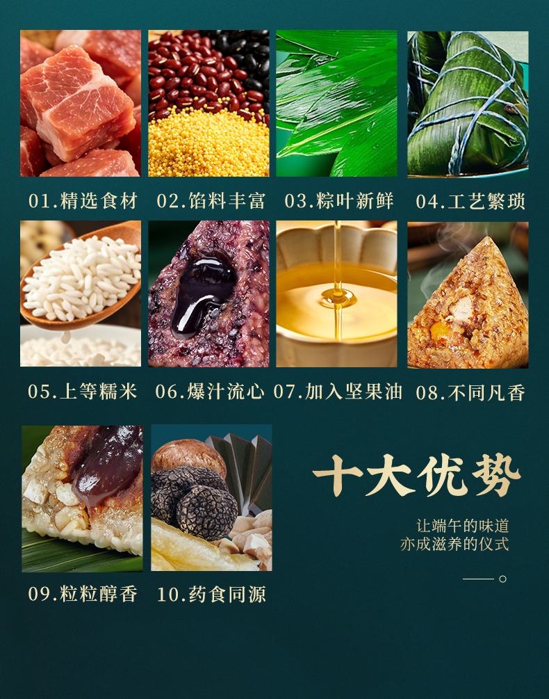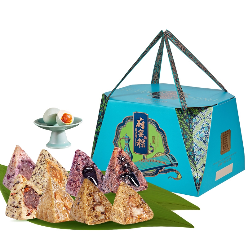 礼盒天圆地方设计,尽显东方美学;盒身精心绘制端午特色元素;内含十粽八味,三肉七素搭配两枚海鸭蛋