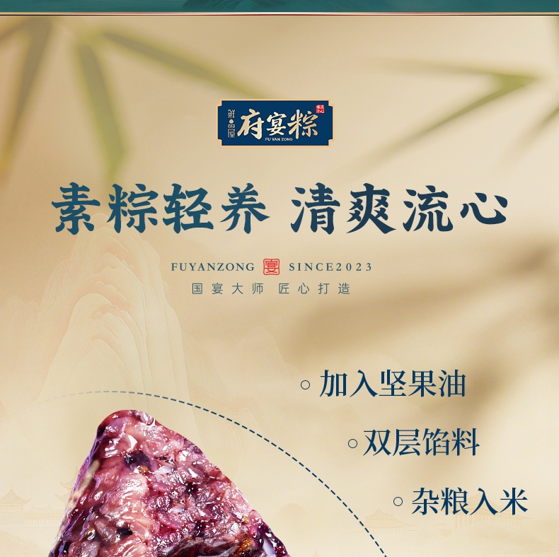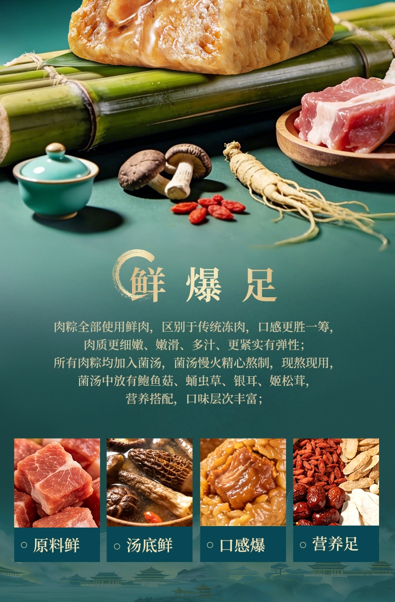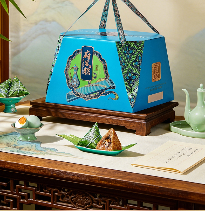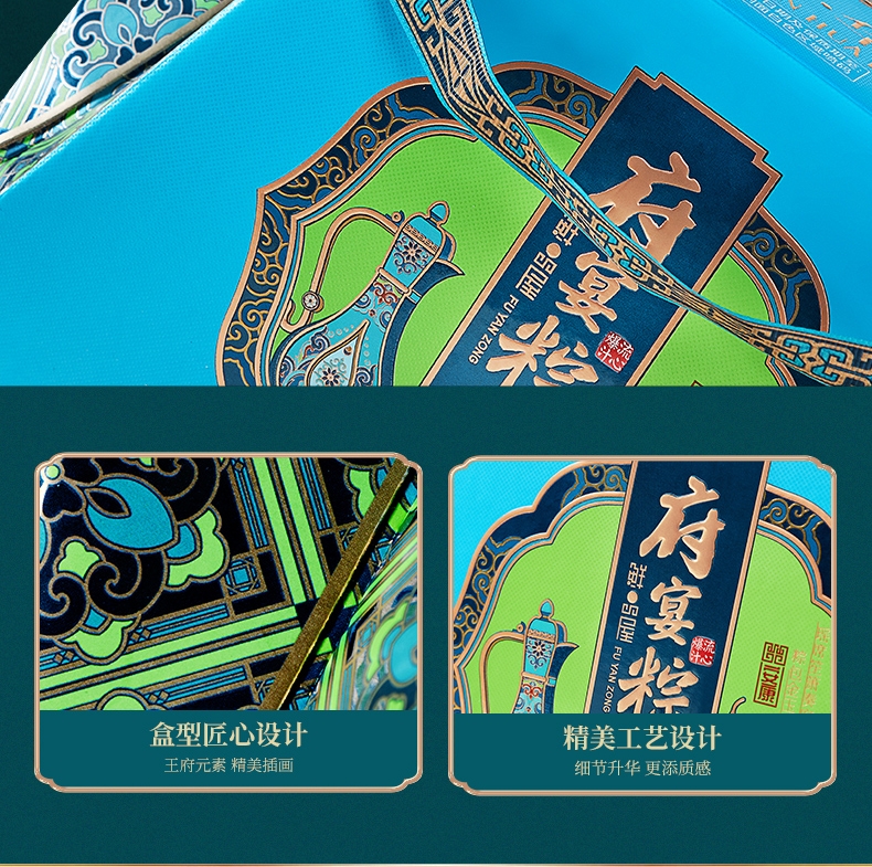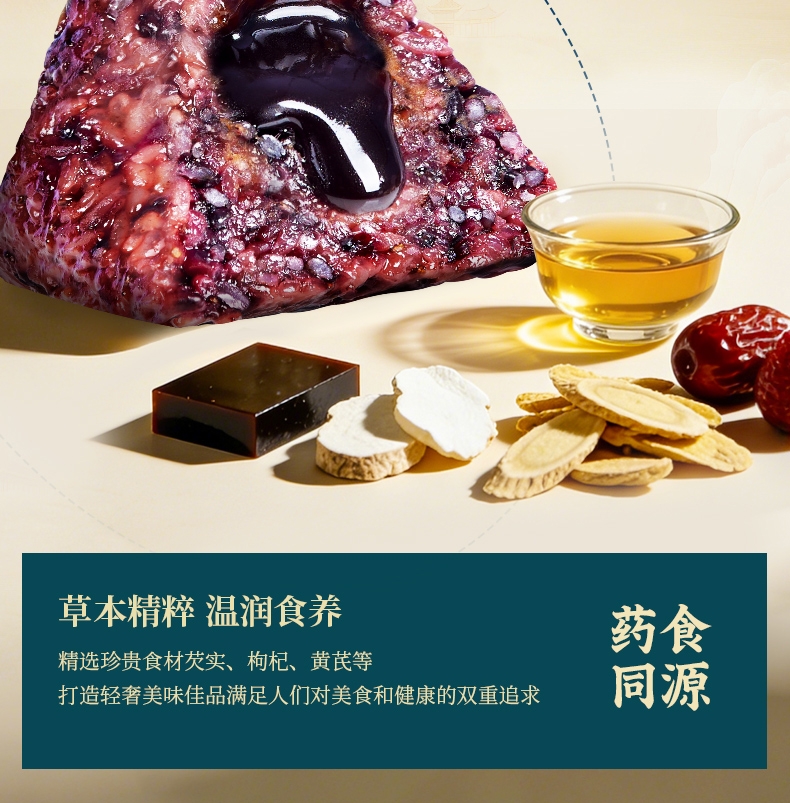 礼盒天圆地方设计,尽显东方美学;盒身精心绘制端午特色元素;内含十粽八味,三肉七素搭配两枚海鸭蛋
