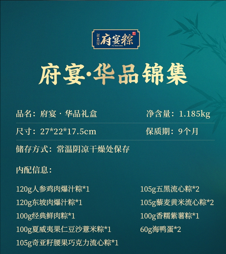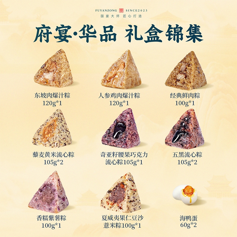 配置清单:1、鲜品屋-120g人参鸡肉爆汁粽*1 2、鲜品屋-120g东坡肉爆汁粽*1 3、鲜品屋-100g经典鲜肉粽*1 4、鲜品屋-105g奇亚籽腰果巧克力流心粽*1 5、鲜品屋-105g五黑流心粽*2 6、鲜品屋-105g藜麦黄米流心粽*2 7、鲜品屋-100g夏威夷果仁豆沙薏米粽*1 8、鲜品屋-100g香糯紫薯粽*1 9、鲜品屋-60g海鸭蛋*2