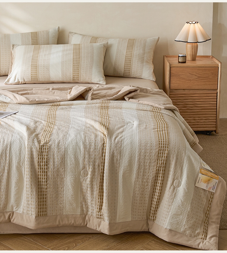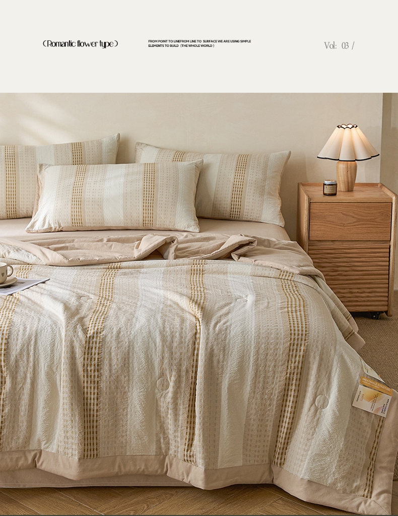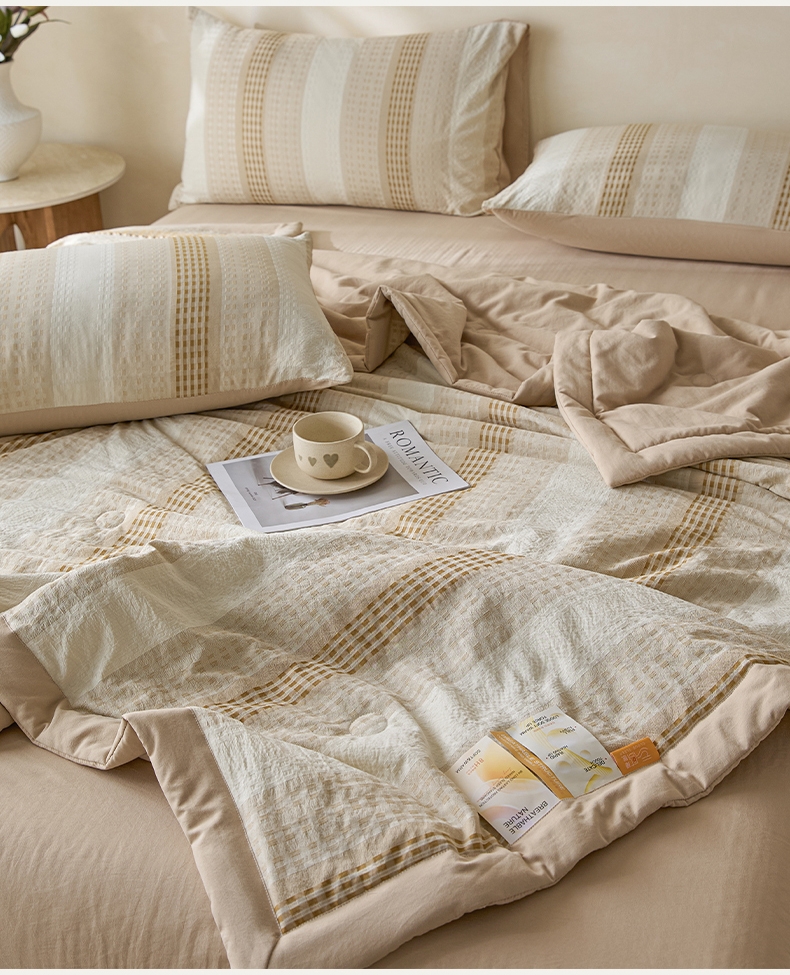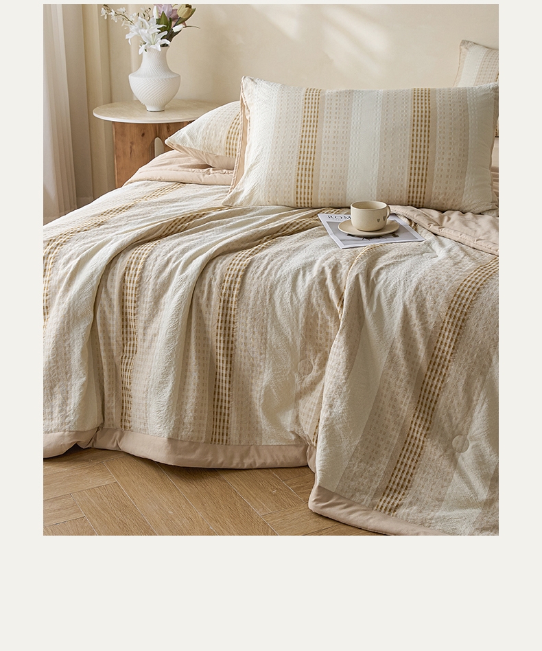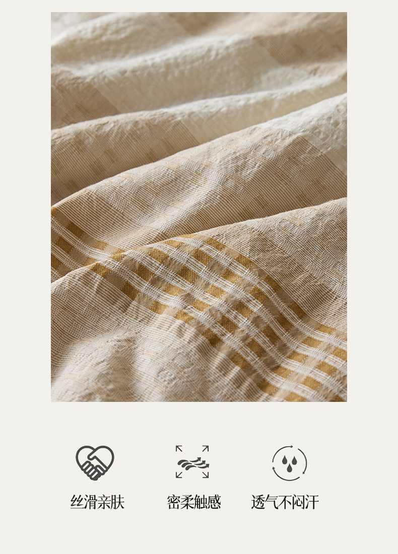 甄选双层泡泡纱面料,A类标准,云端柔软;整张抗菌羽丝棉填充;10%大豆蓬松柔软,轻薄不压身;宽边设计,撞色包边