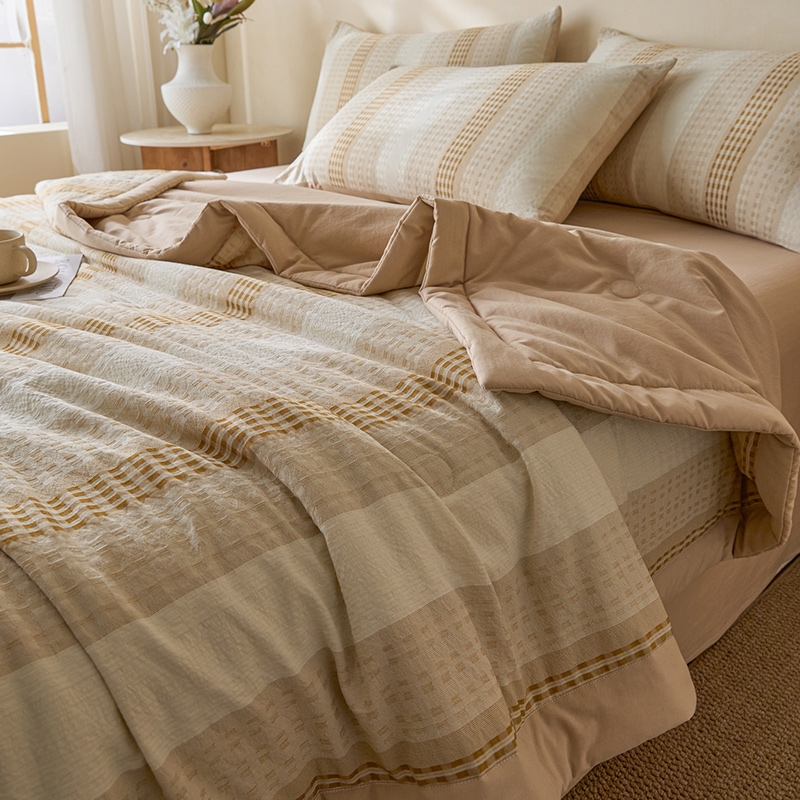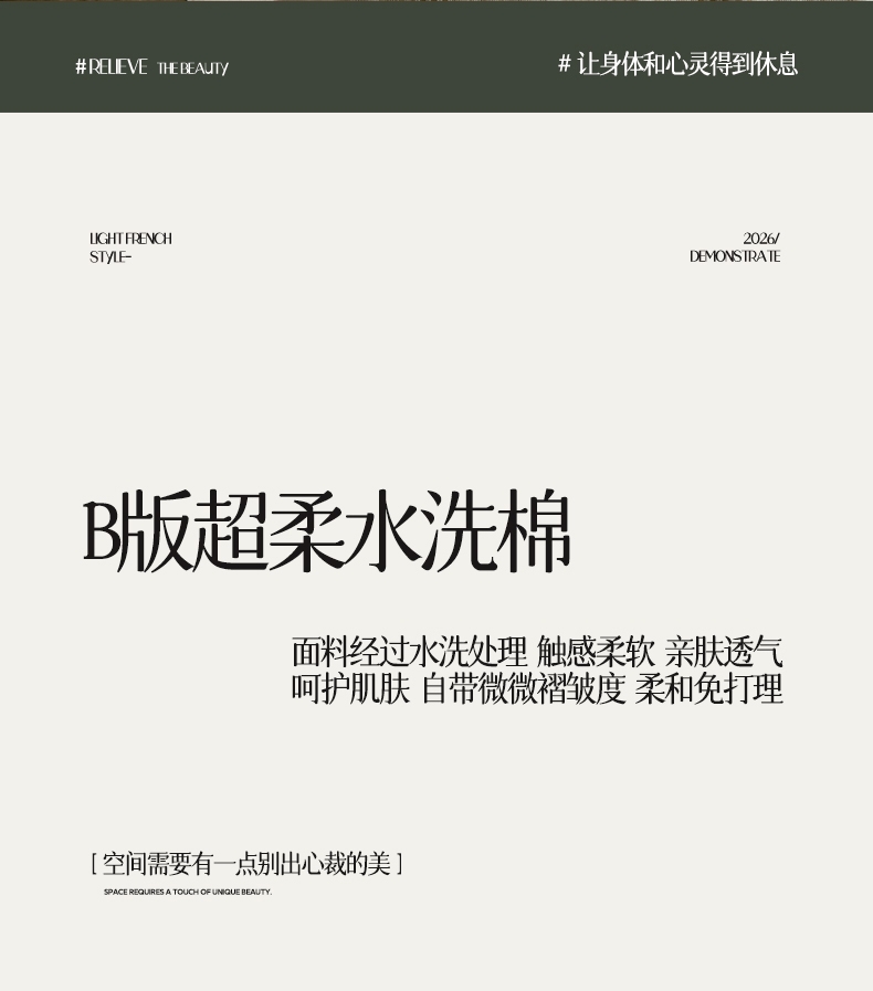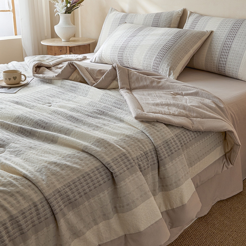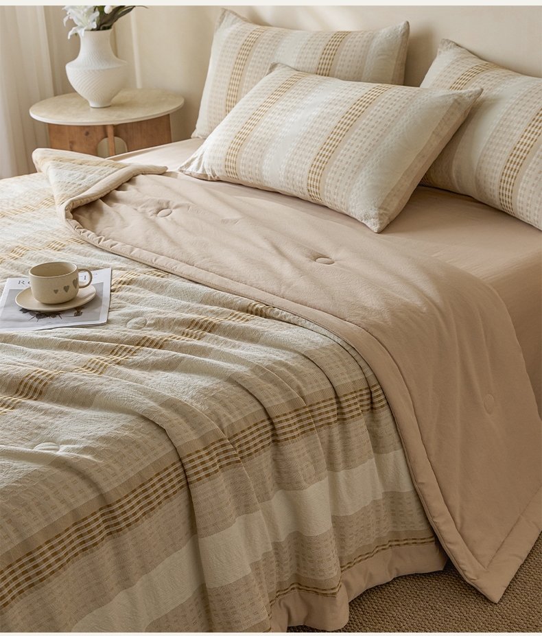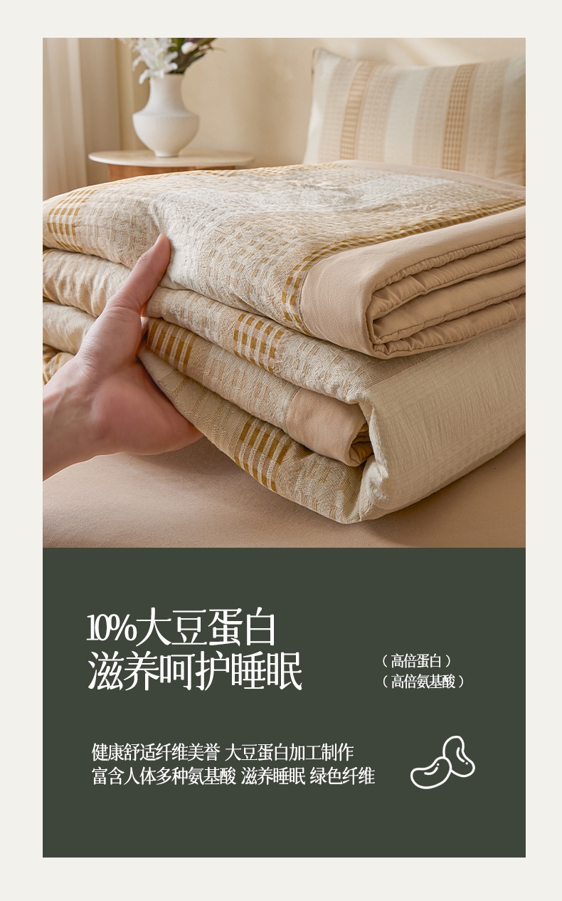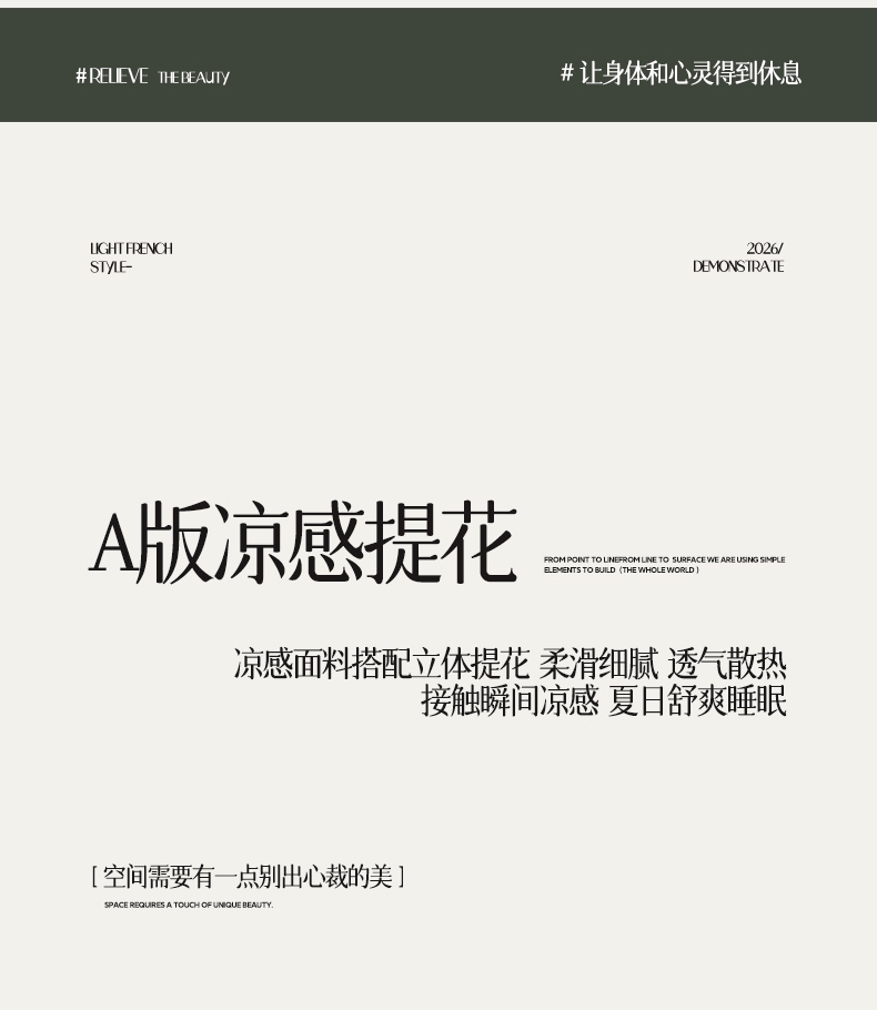 甄选双层泡泡纱面料,A类标准,云端柔软;整张抗菌羽丝棉填充;10%大豆蓬松柔软,轻薄不压身;宽边设计,撞色包边