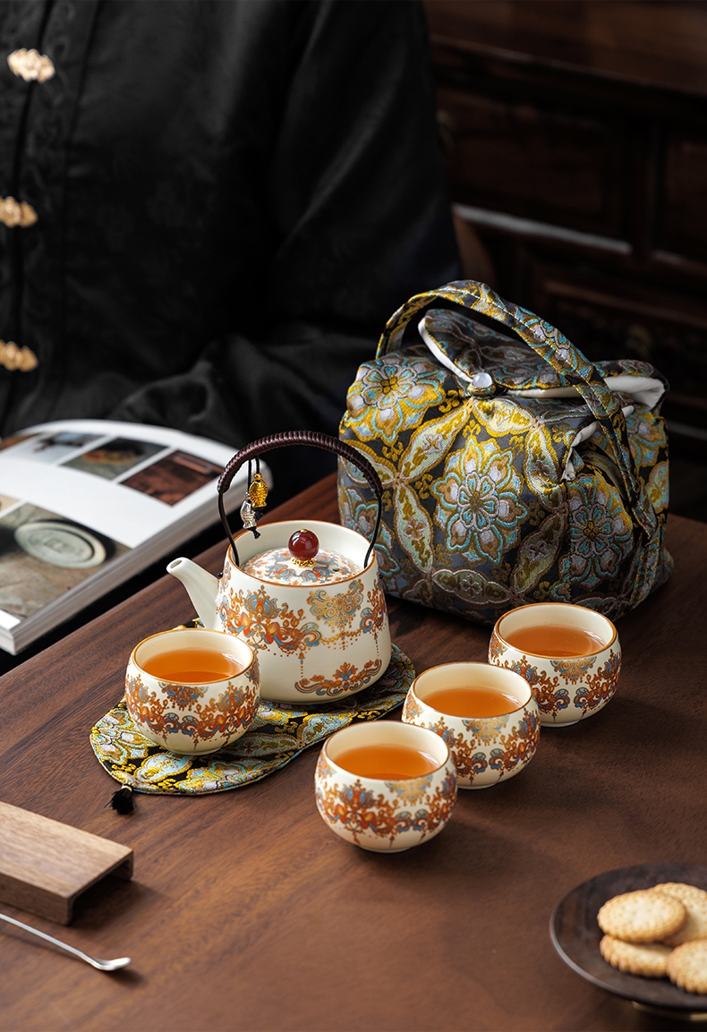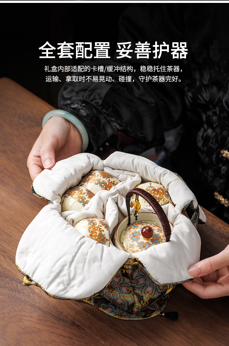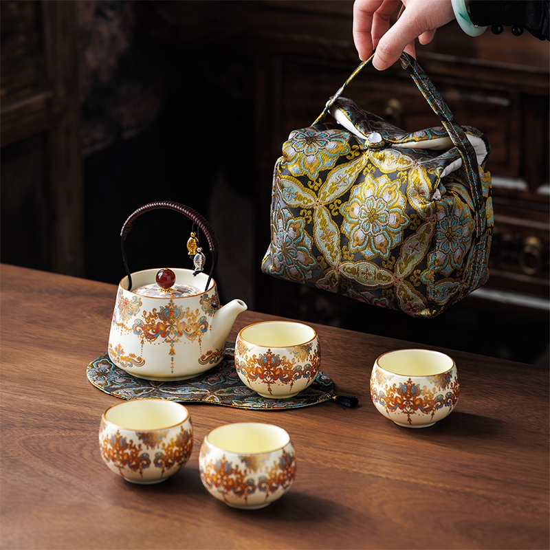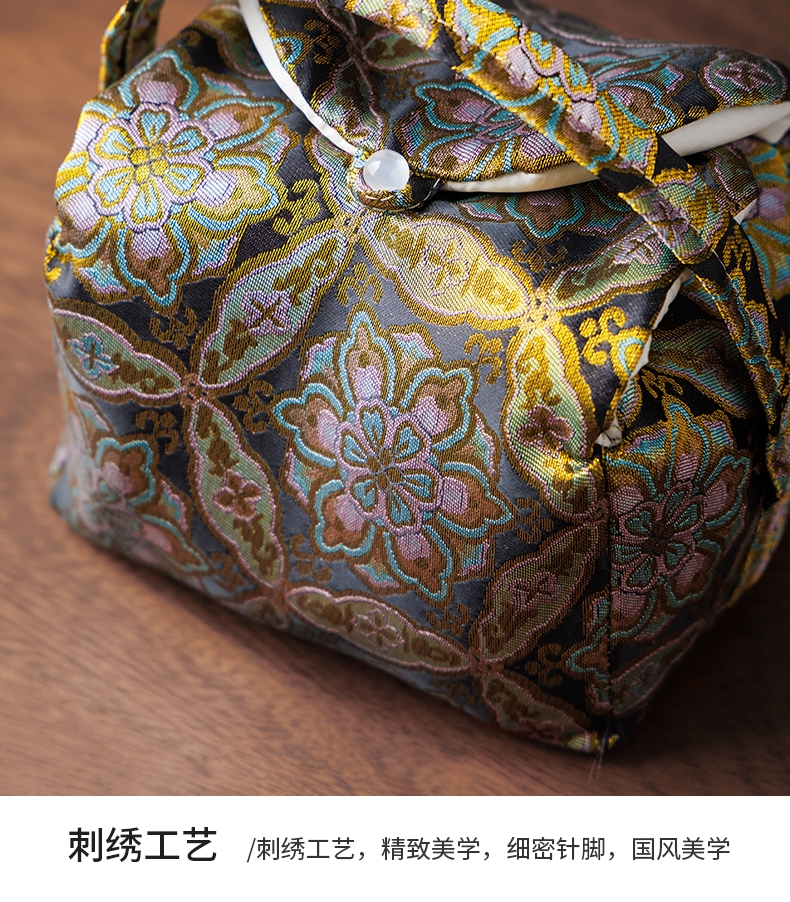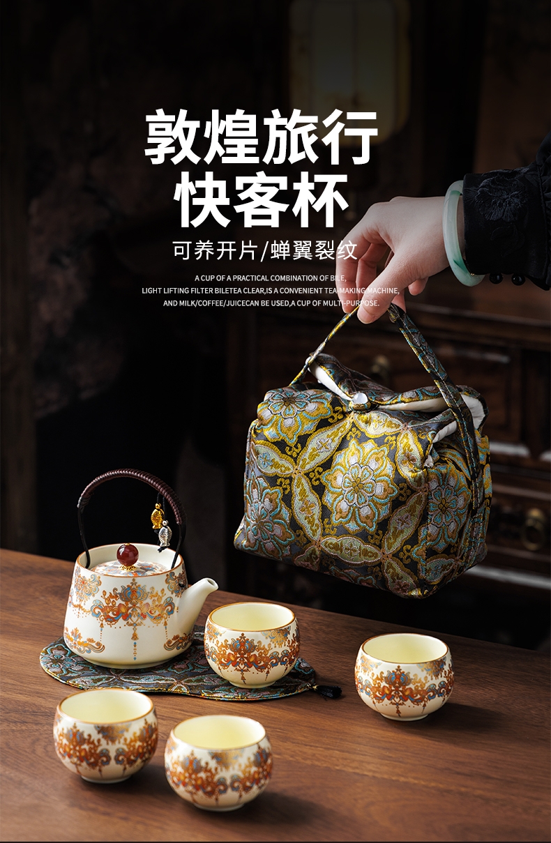 敦煌艺术风格,色彩绚丽且富有古典韵味;茶具上的花纹绘制精细,色彩搭配和谐;配备专门的织锦布包,方便携带和收纳