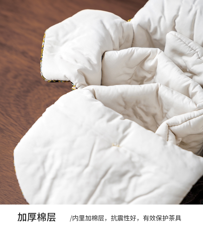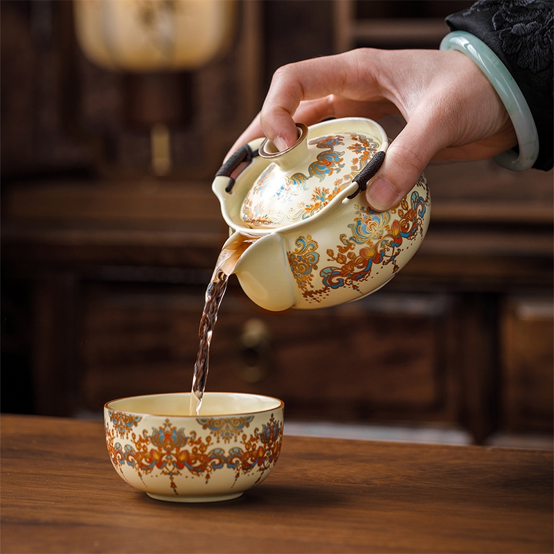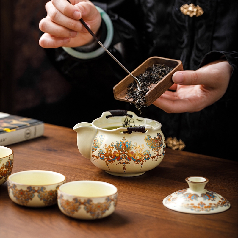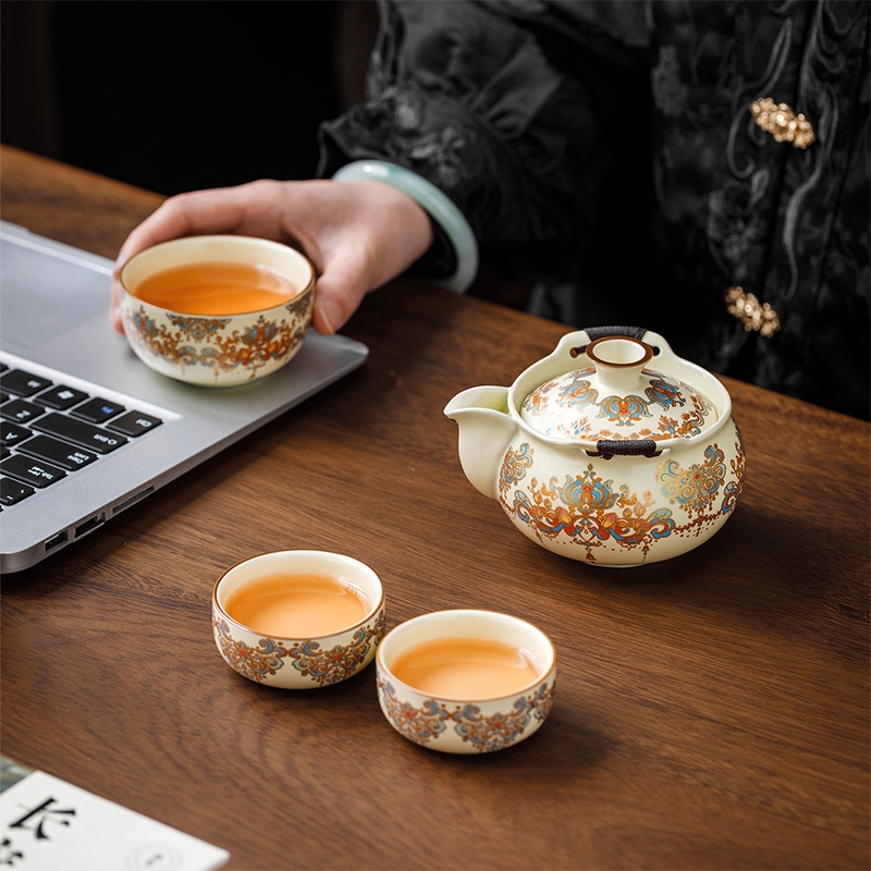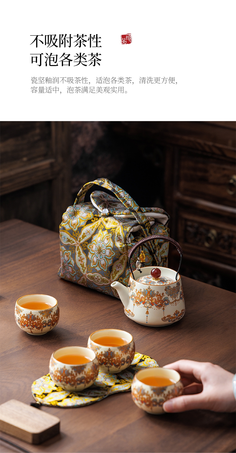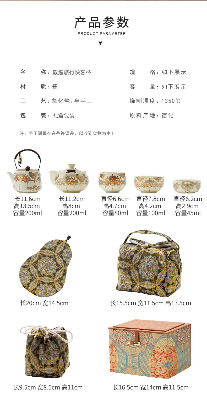 敦煌艺术风格,色彩绚丽且富有古典韵味;茶具上的花纹绘制精细,色彩搭配和谐;配备专门的织锦布包,方便携带和收纳