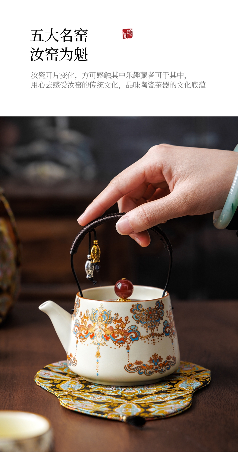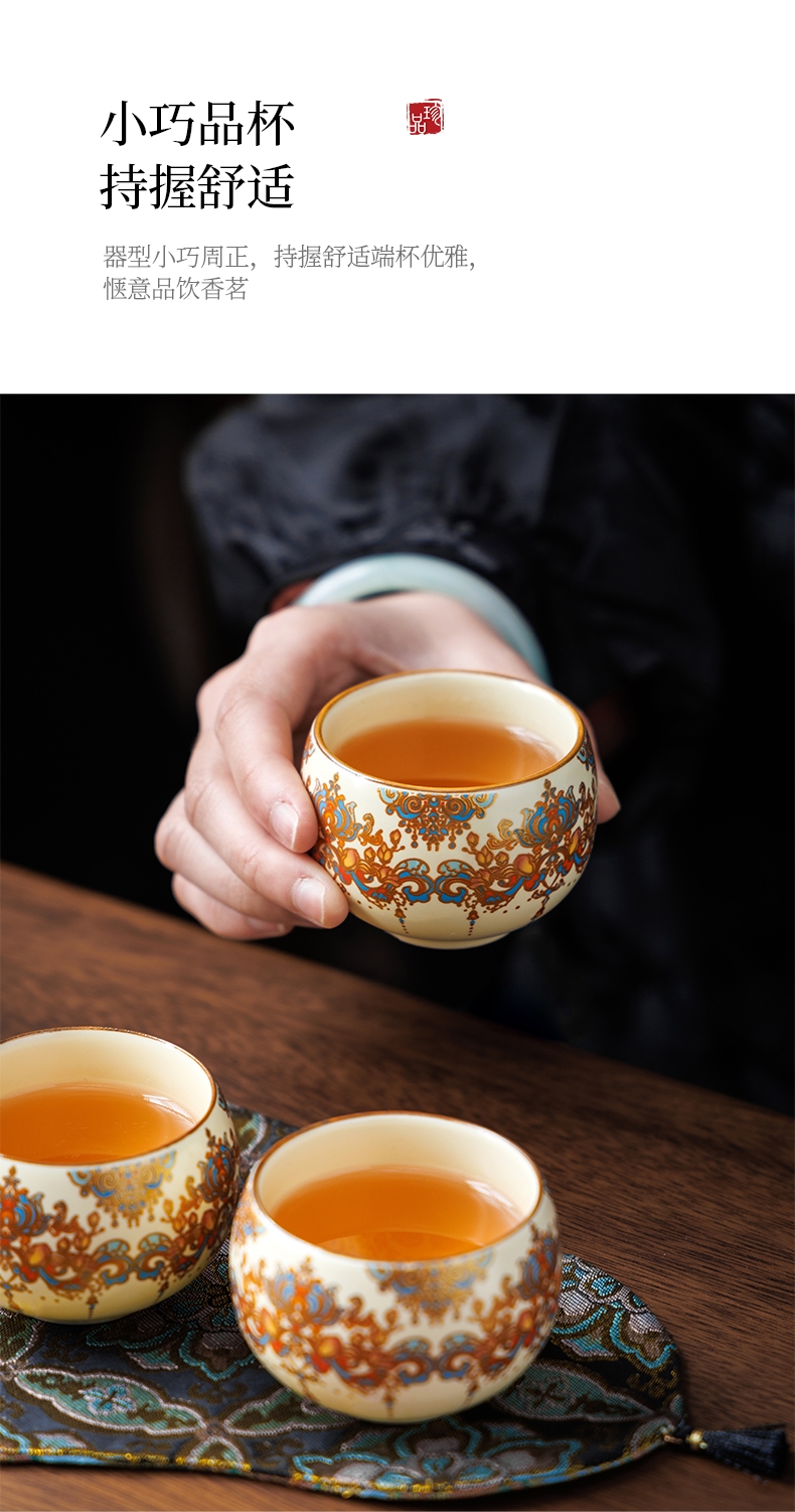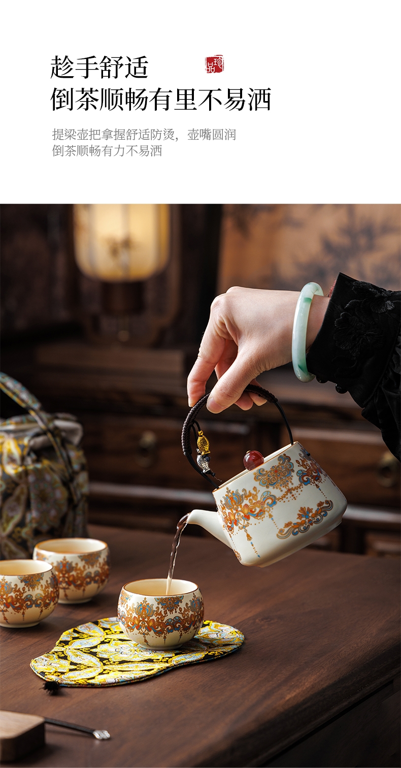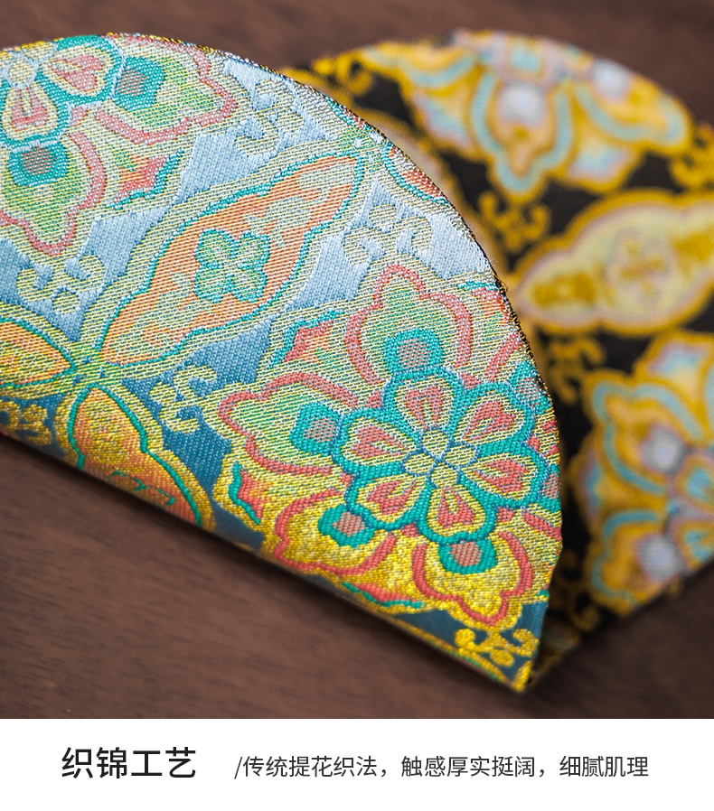 敦煌艺术风格,色彩绚丽且富有古典韵味;茶具上的花纹绘制精细,色彩搭配和谐;配备专门的织锦布包,方便携带和收纳