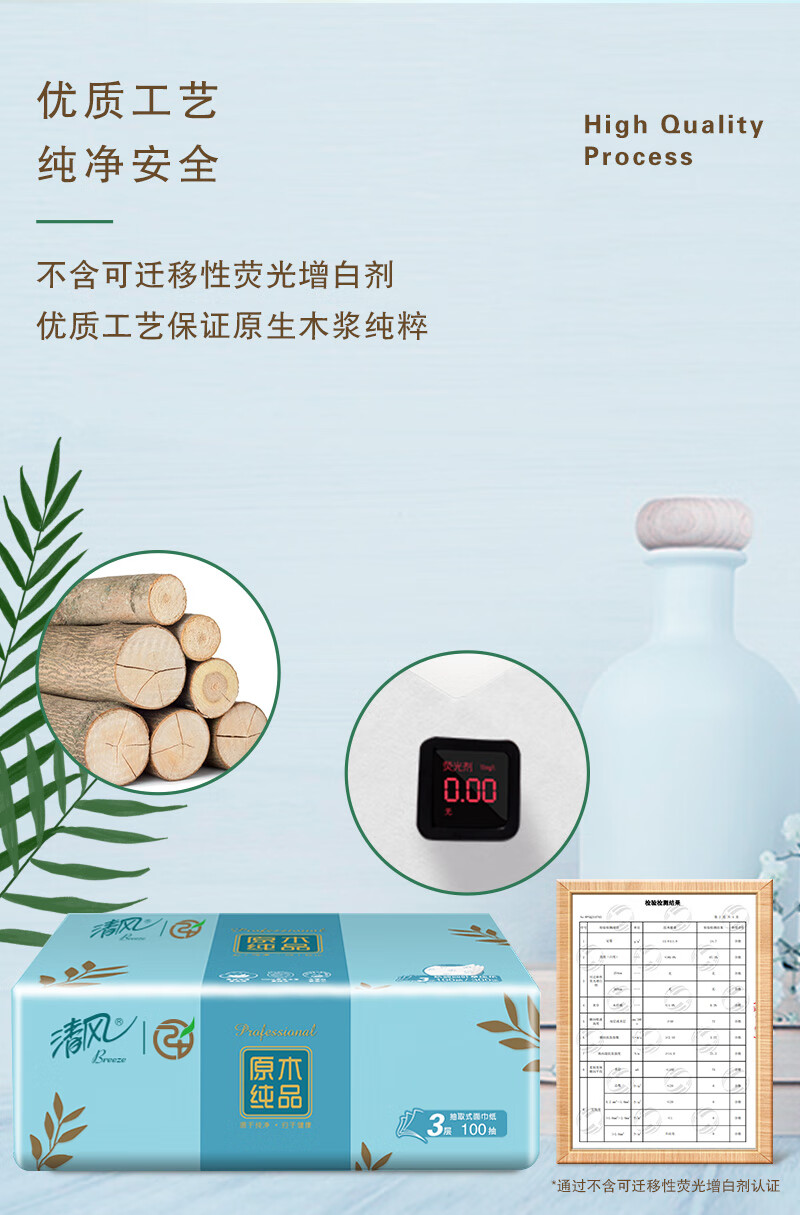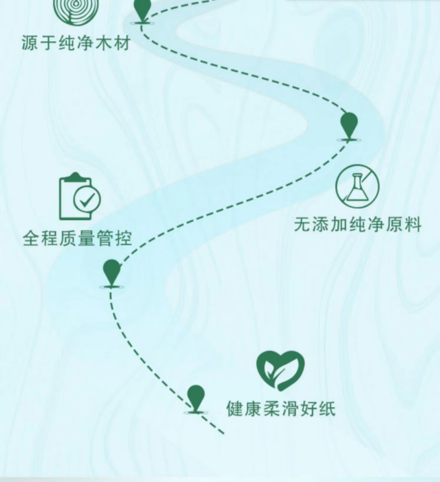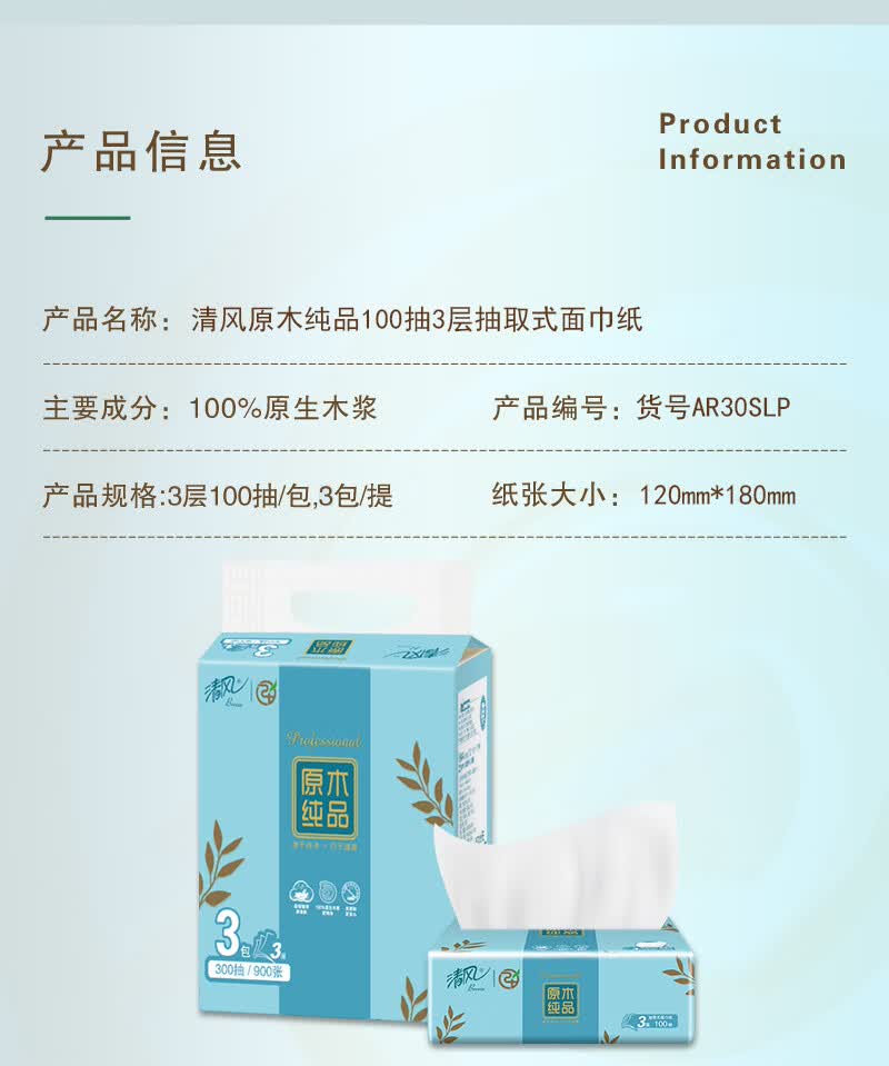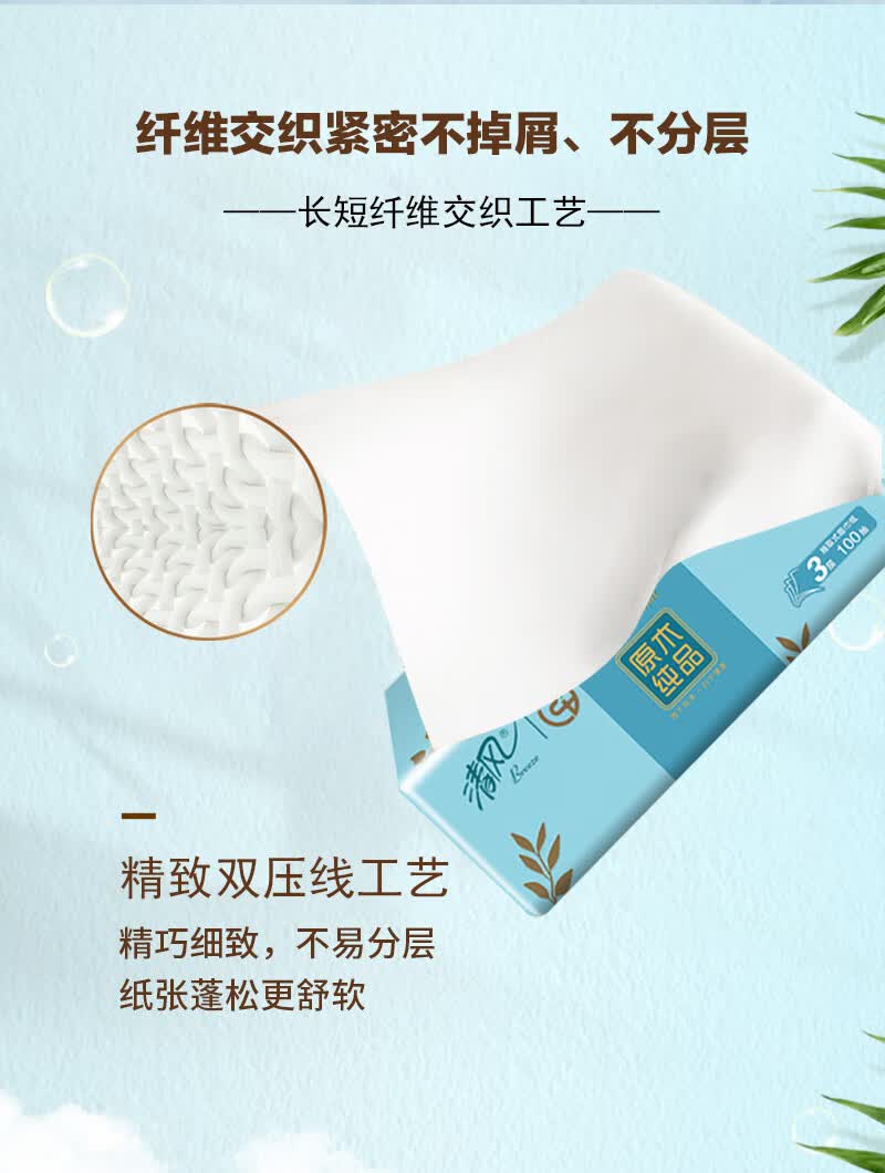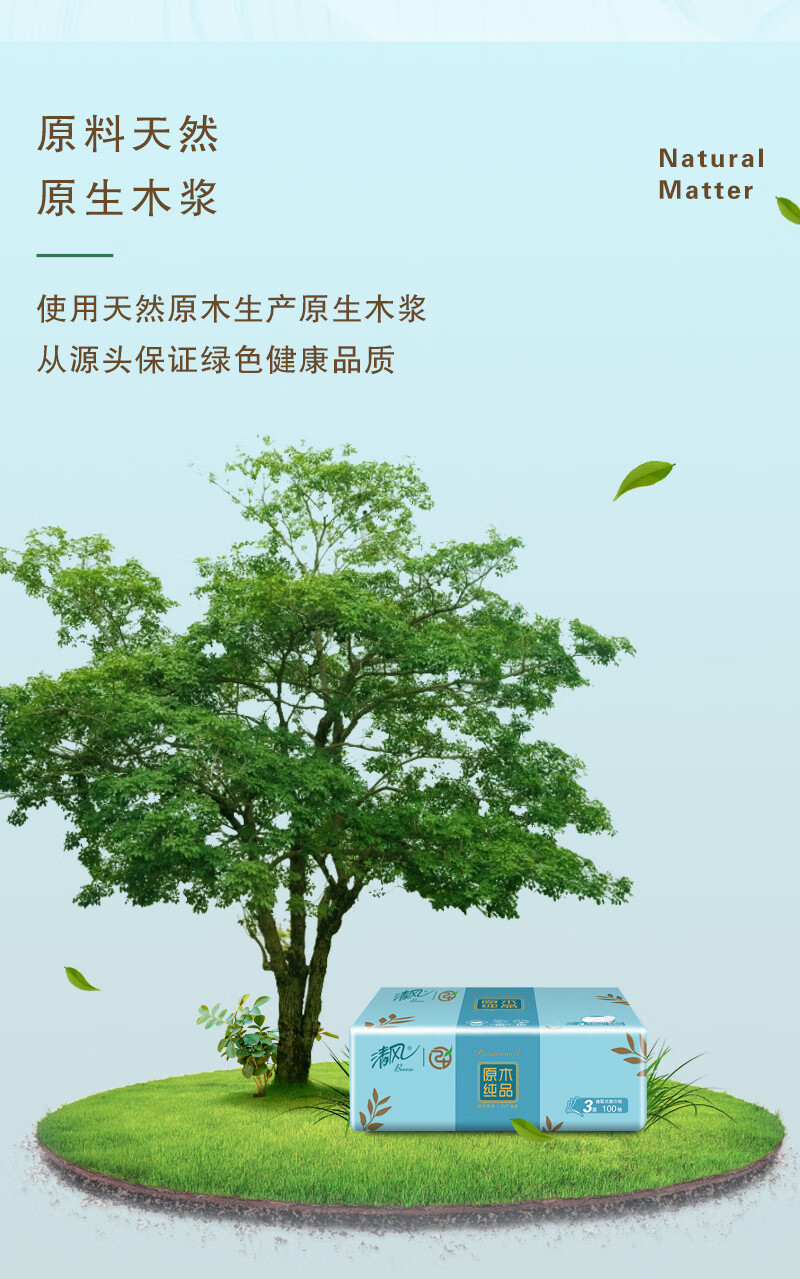 采用100%原生木浆制纸;纸质细腻柔软,使肌肤倍感舒适;纯净的木质纤维