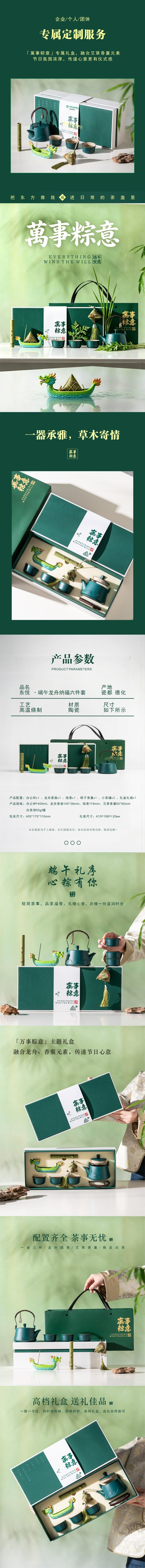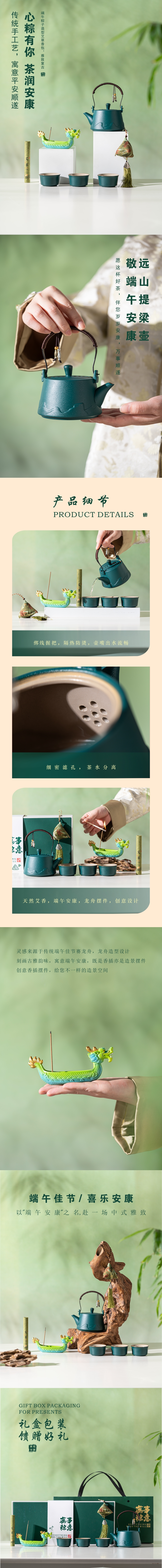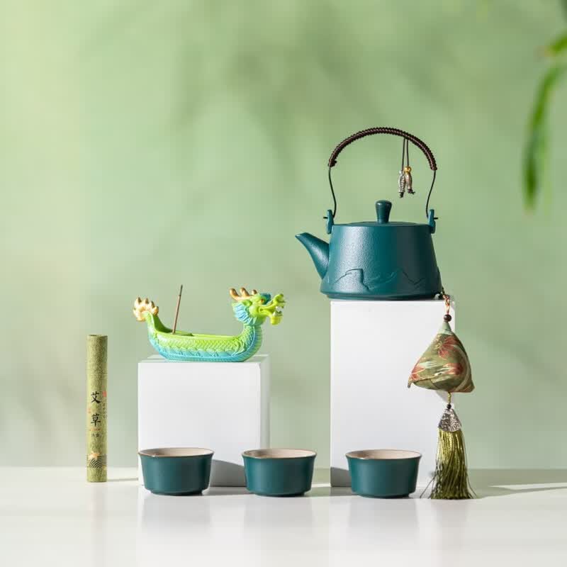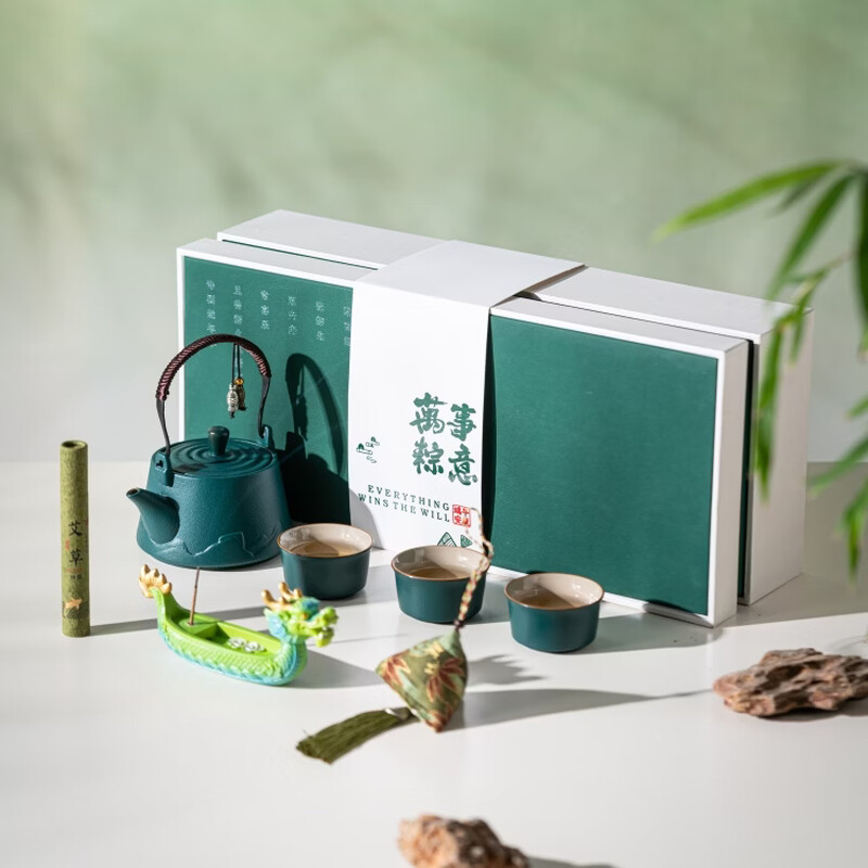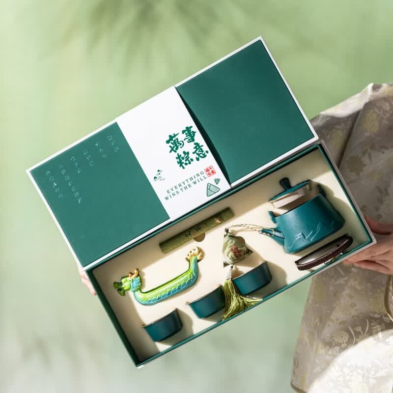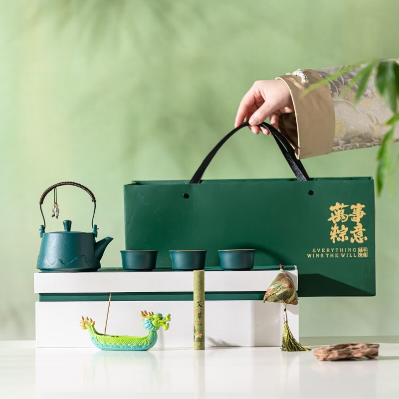 端午主题:「万事粽意」IP设计,传递节日心意;完整套组:一壶三杯+艾草香礼,场景丰富;质感高级:墨绿哑光釉面,东方美学质感