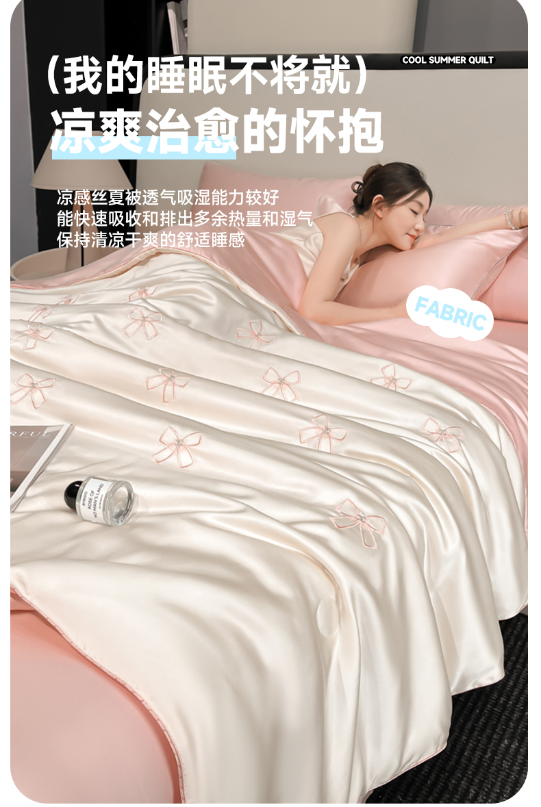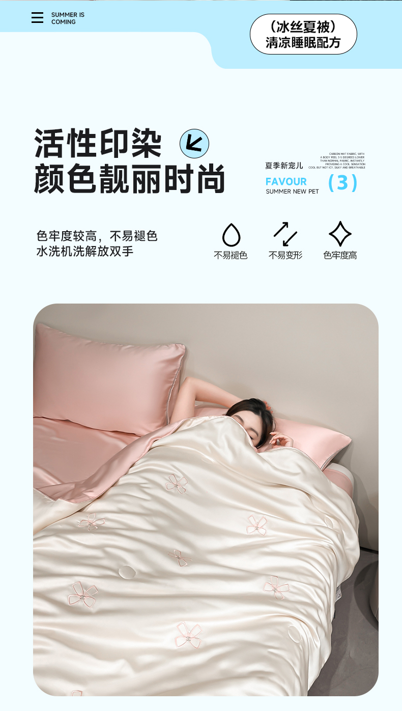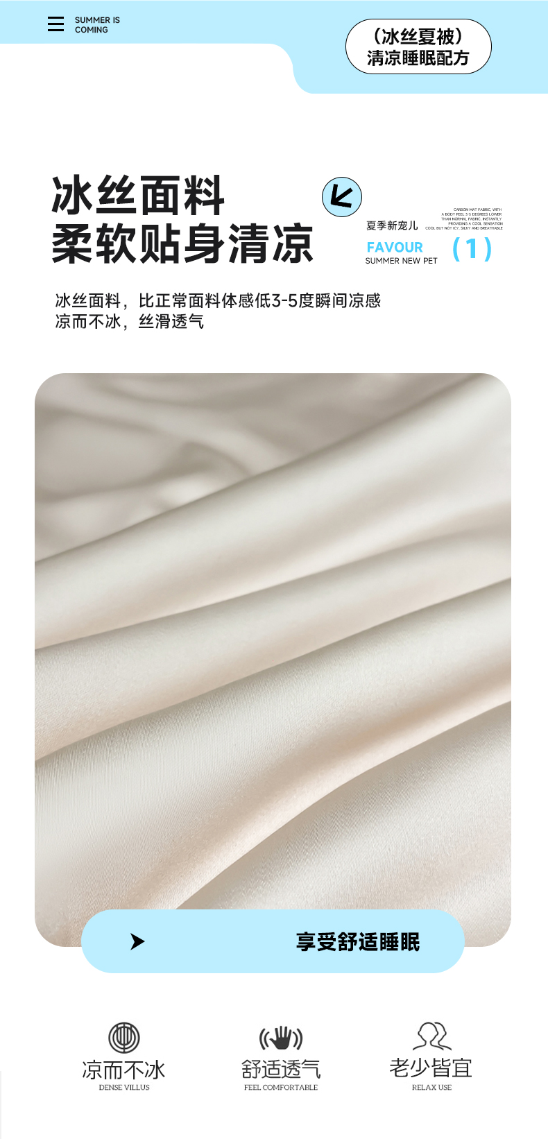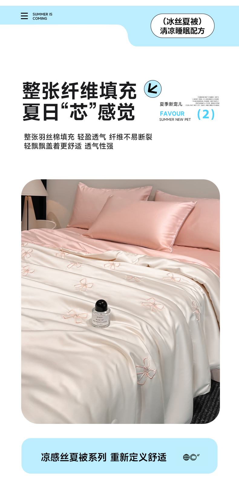 优质的凉感丝面料,丝滑透气,凉而不冰,比正常面料体;花型设计传承了经典简约风,选择较为简约温馨的颜色,;绿色环保印染技术,环保健康,严控PH值甲醛等,枕套