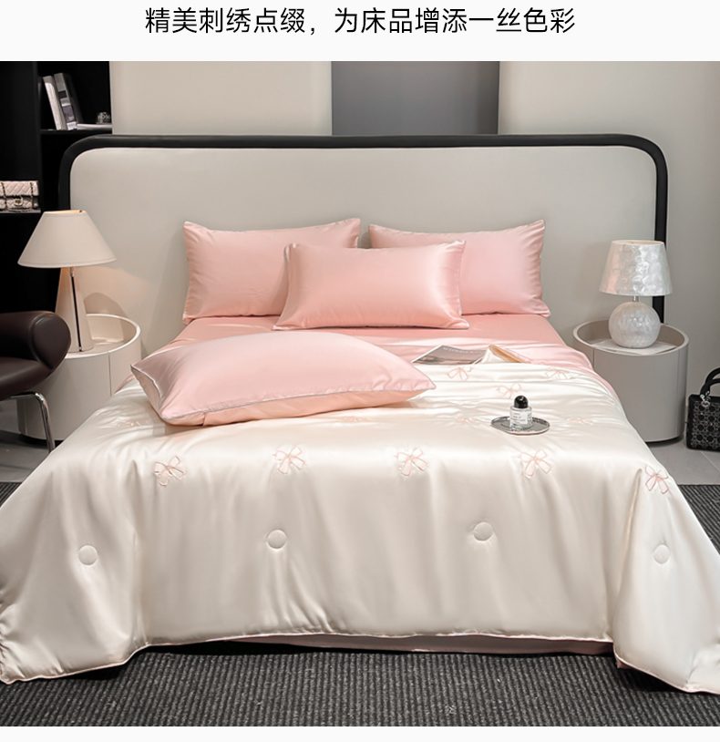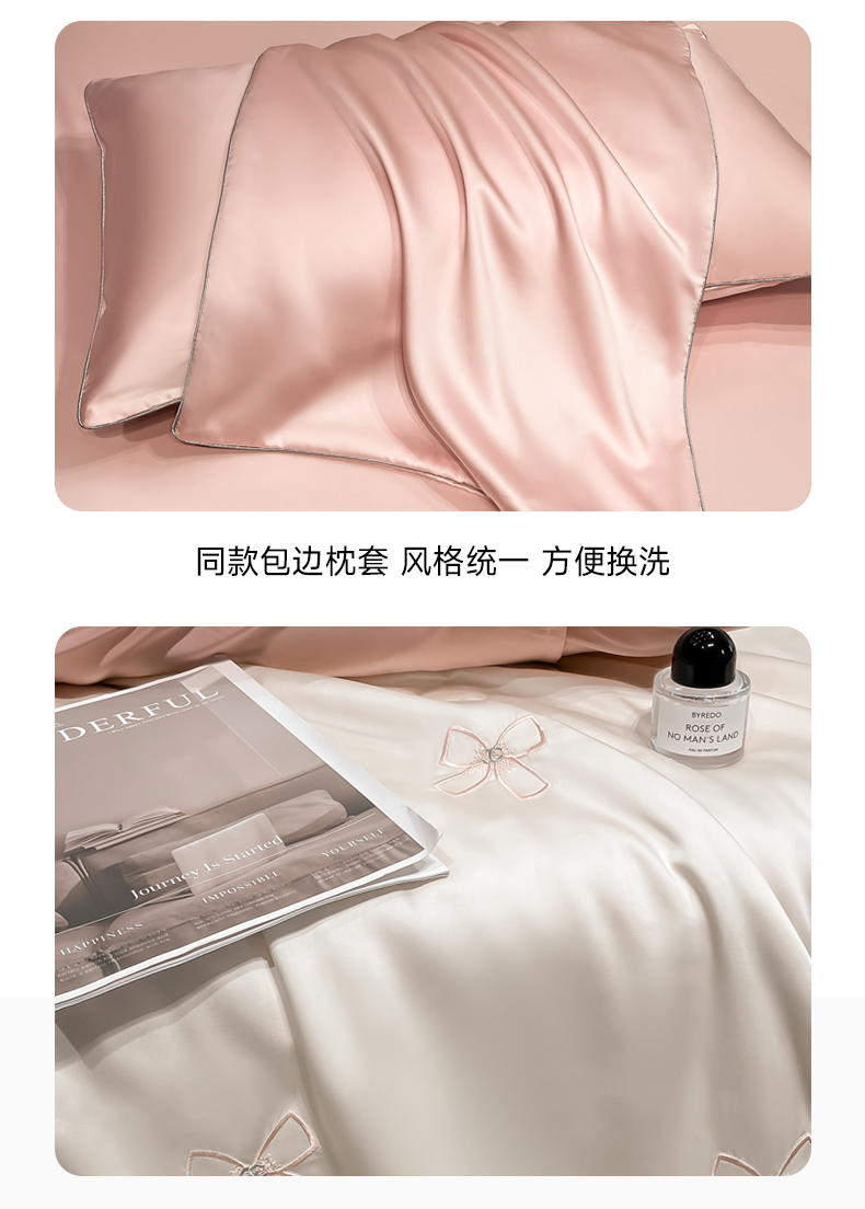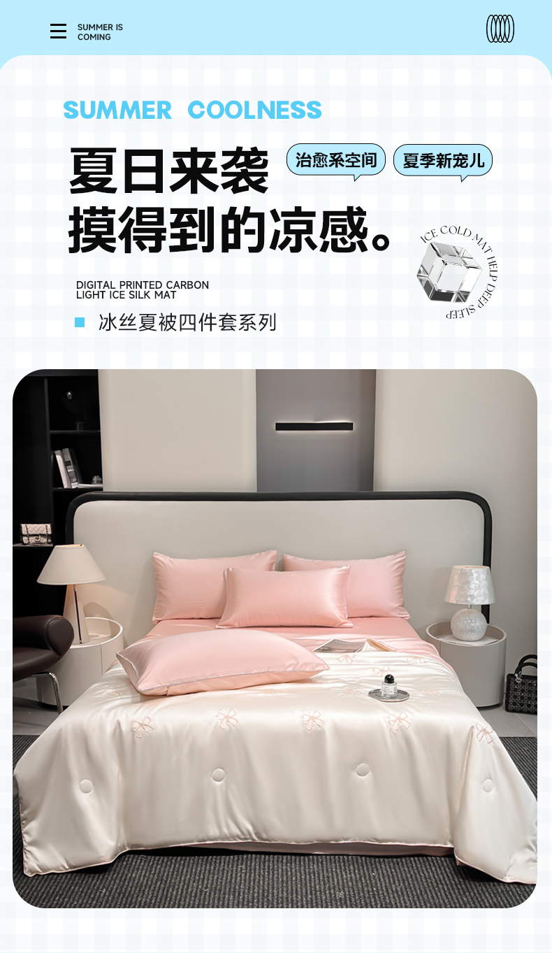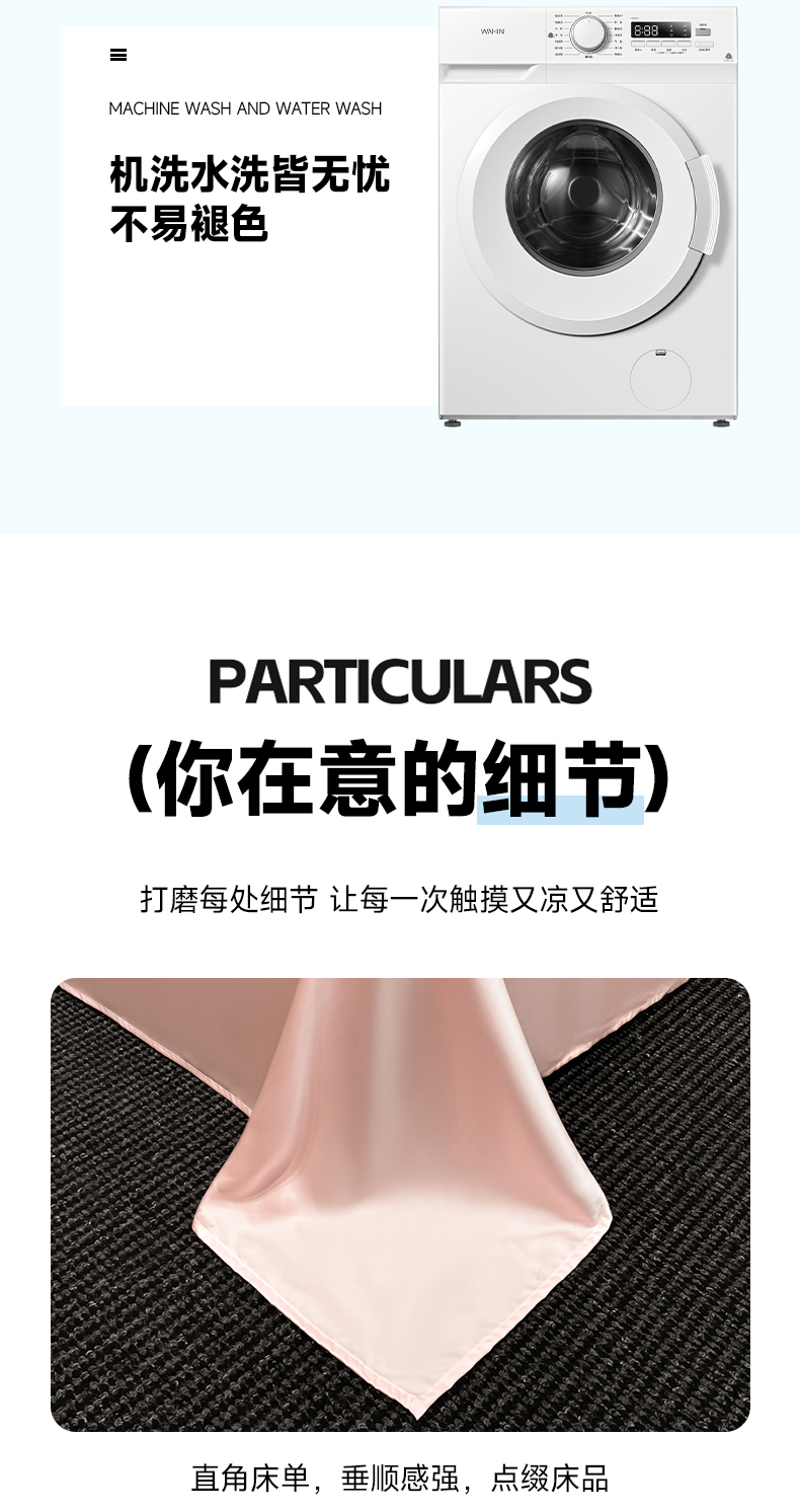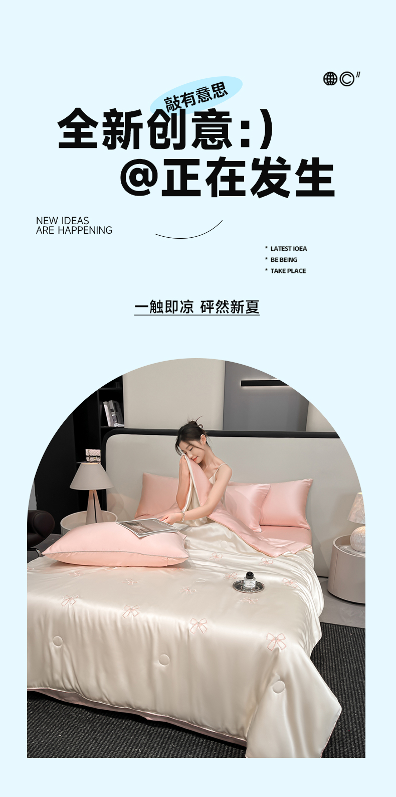 优质的凉感丝面料,丝滑透气,凉而不冰,比正常面料体;花型设计传承了经典简约风,选择较为简约温馨的颜色,;绿色环保印染技术,环保健康,严控PH值甲醛等,枕套