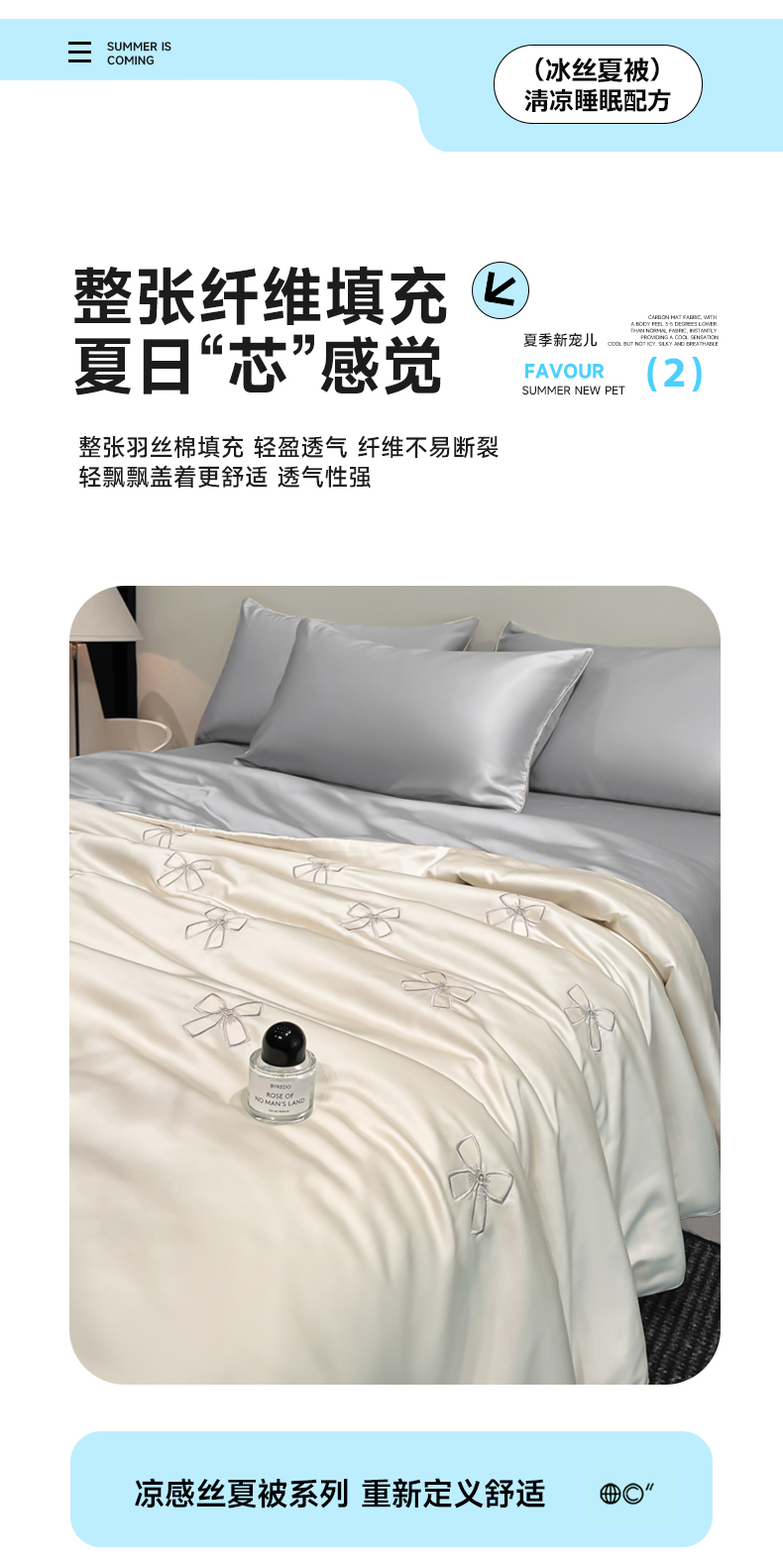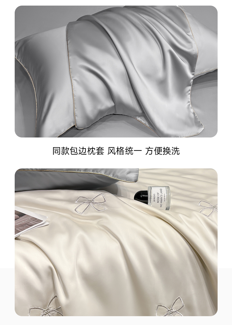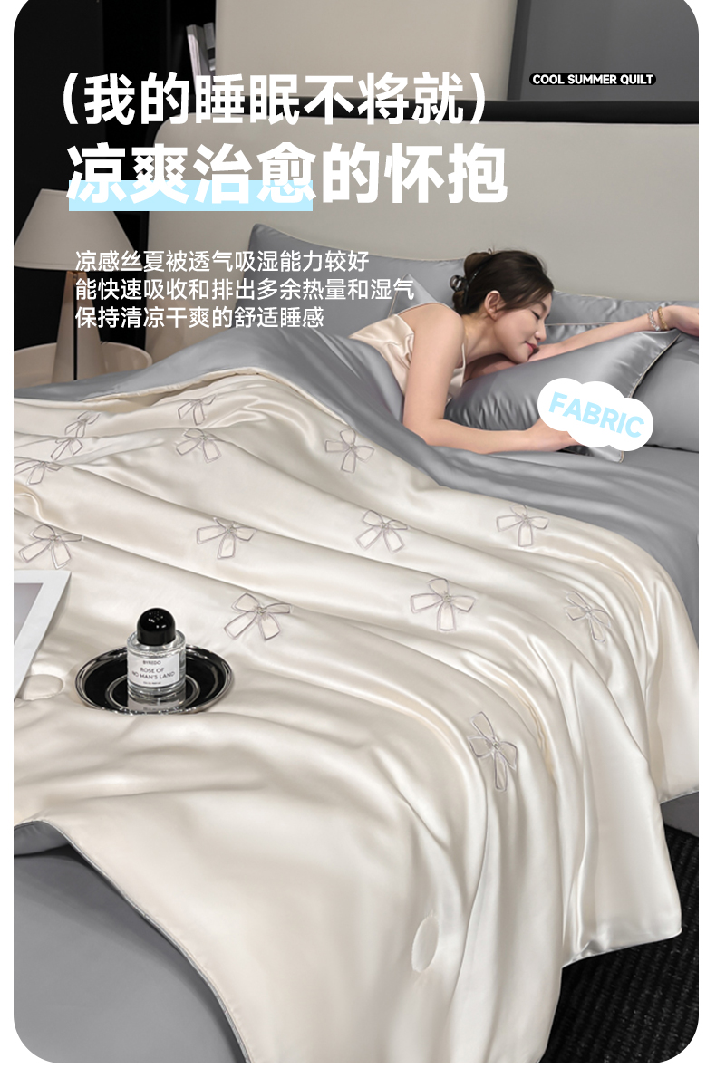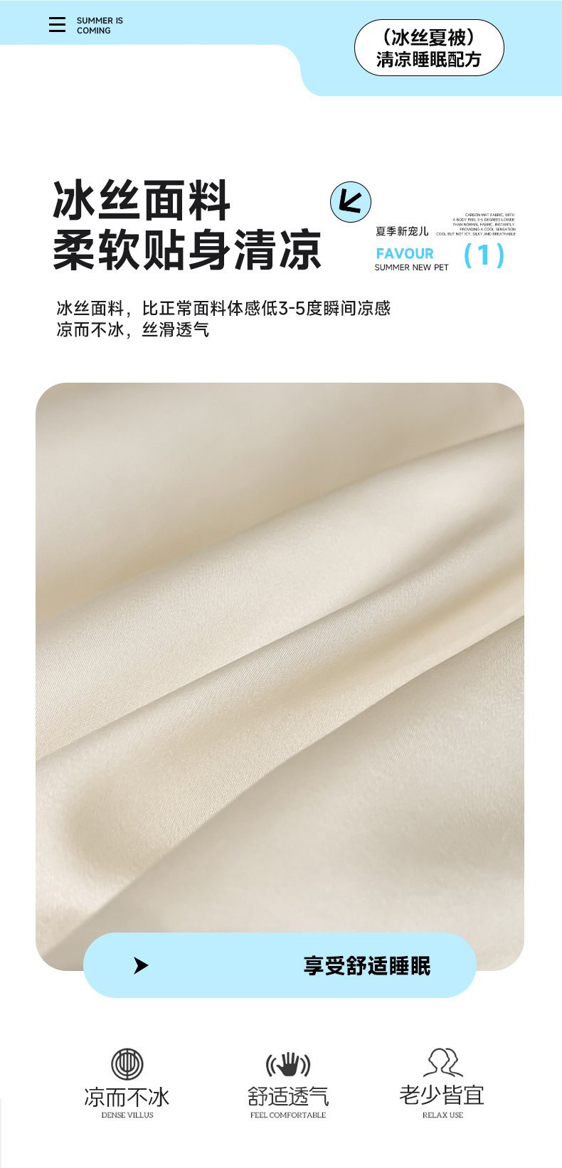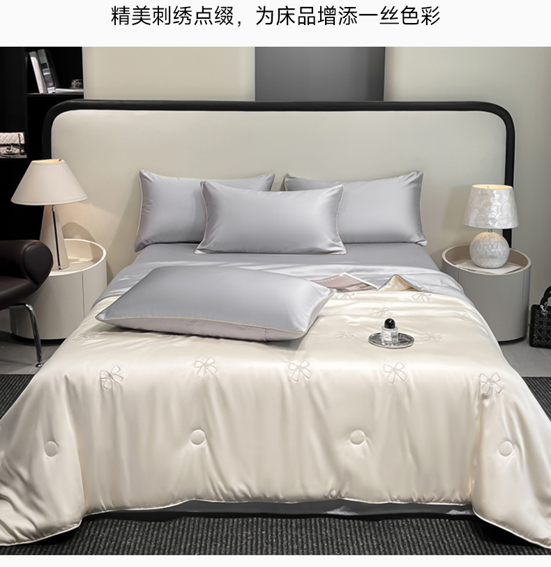 采用优质的凉感丝面料,丝滑透气,凉而不冰,比正常面;花型设计传承了经典简约风,选择较为简约温馨的颜色,; 绿色环保印染技术,环保健康,严控PH值甲醛等,枕