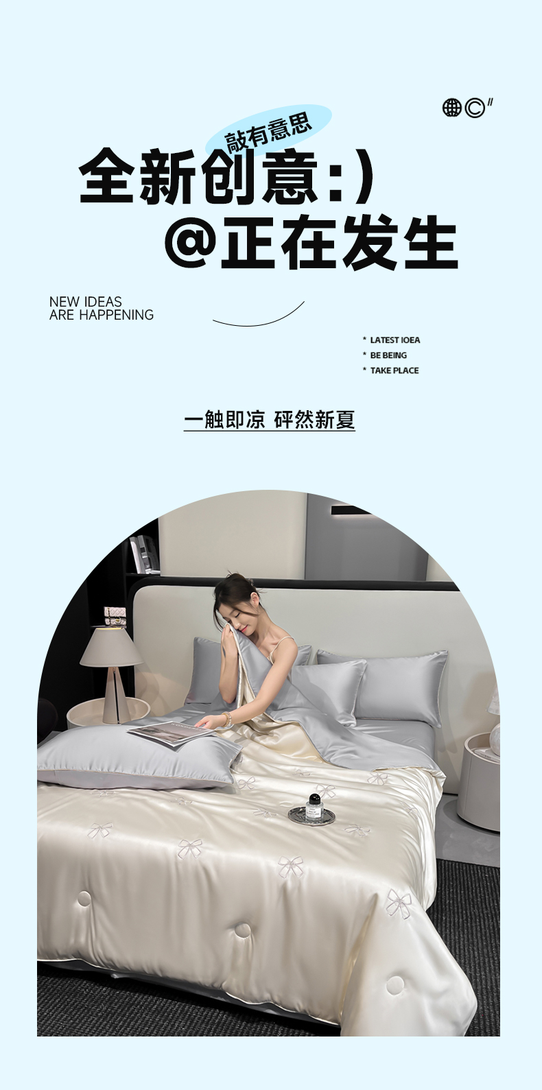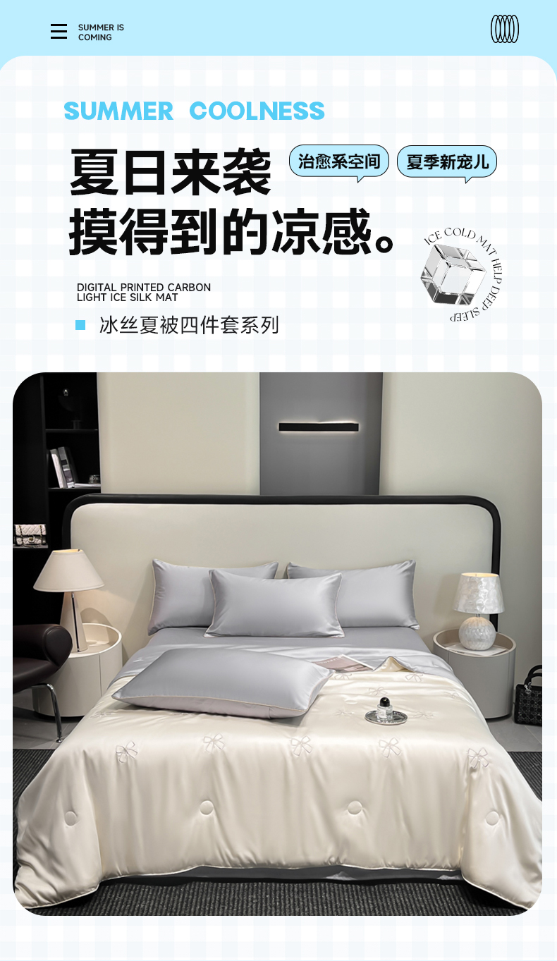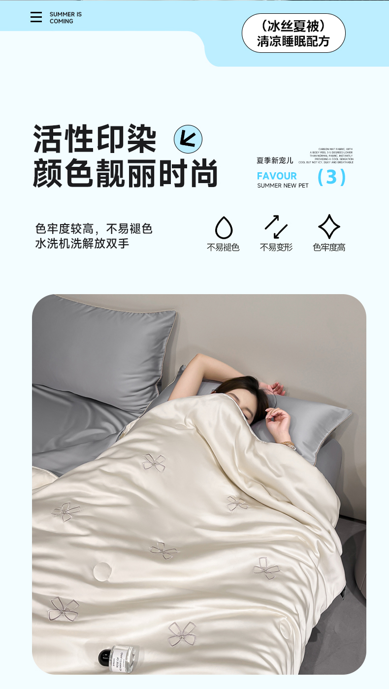 采用优质的凉感丝面料,丝滑透气,凉而不冰,比正常面;花型设计传承了经典简约风,选择较为简约温馨的颜色,; 绿色环保印染技术,环保健康,严控PH值甲醛等,枕