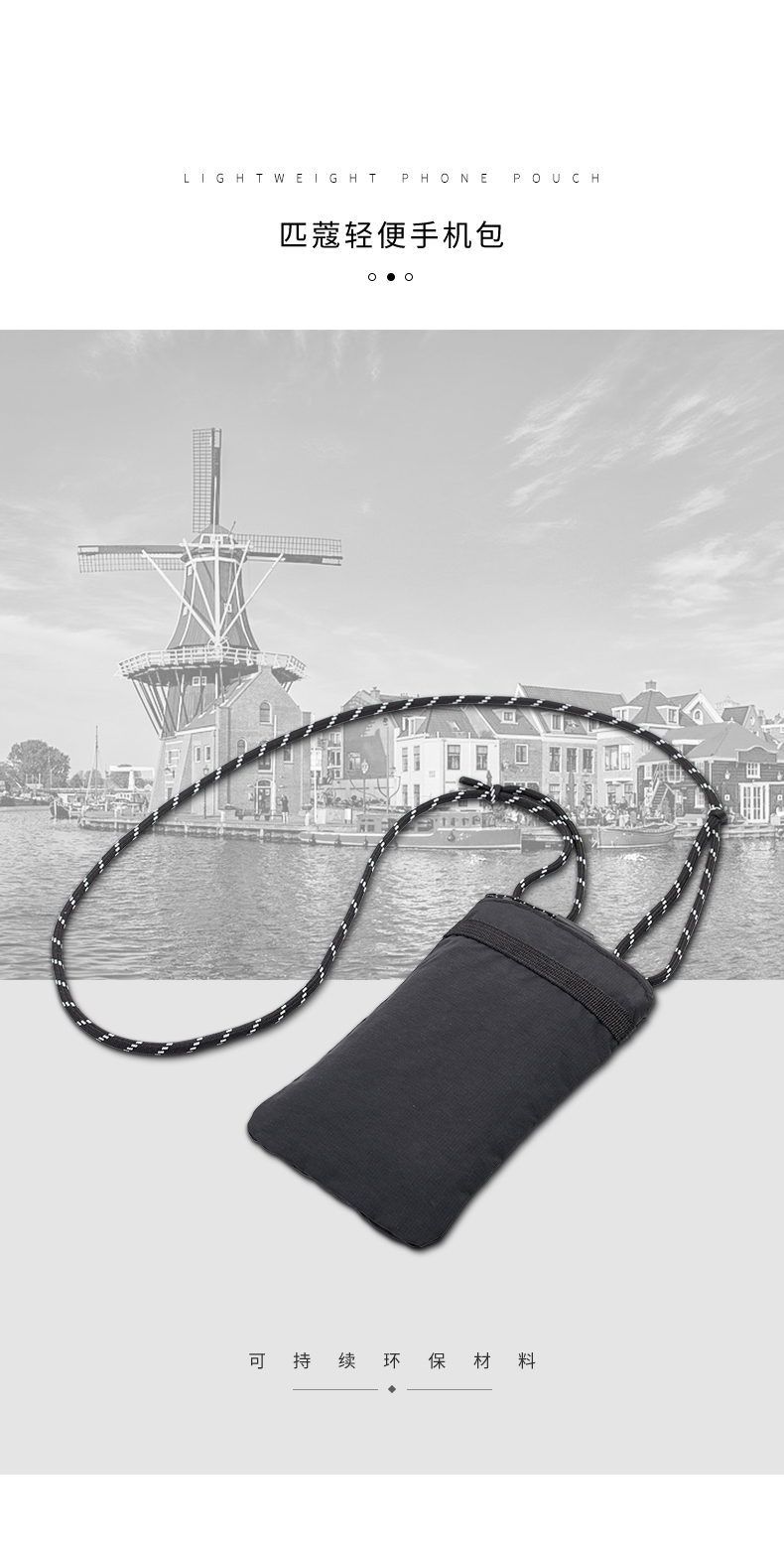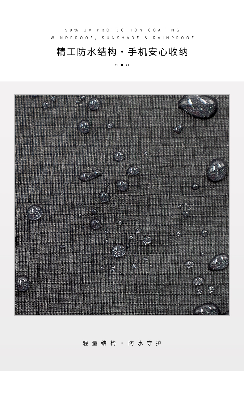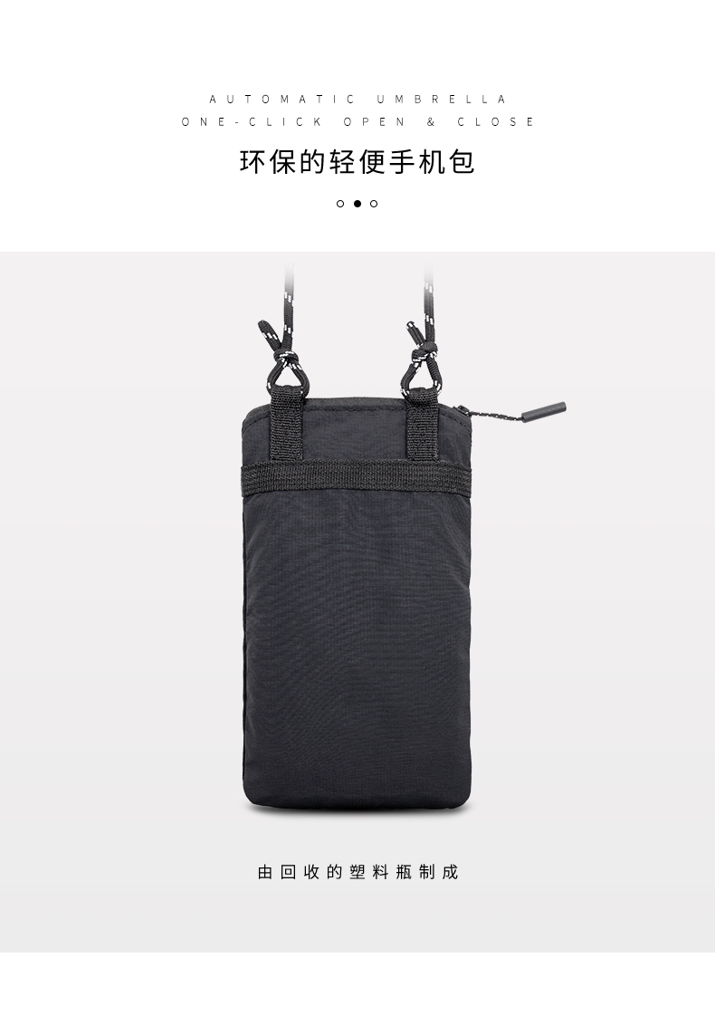 防水可循环再生尼龙面料,无惧雨水泼溅和日常污渍;仅重 38 克, 让你几乎感觉不到它的存在;极简风格与坚实实用性完美结合,日常通勤户外野营必备