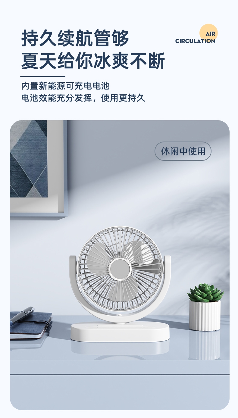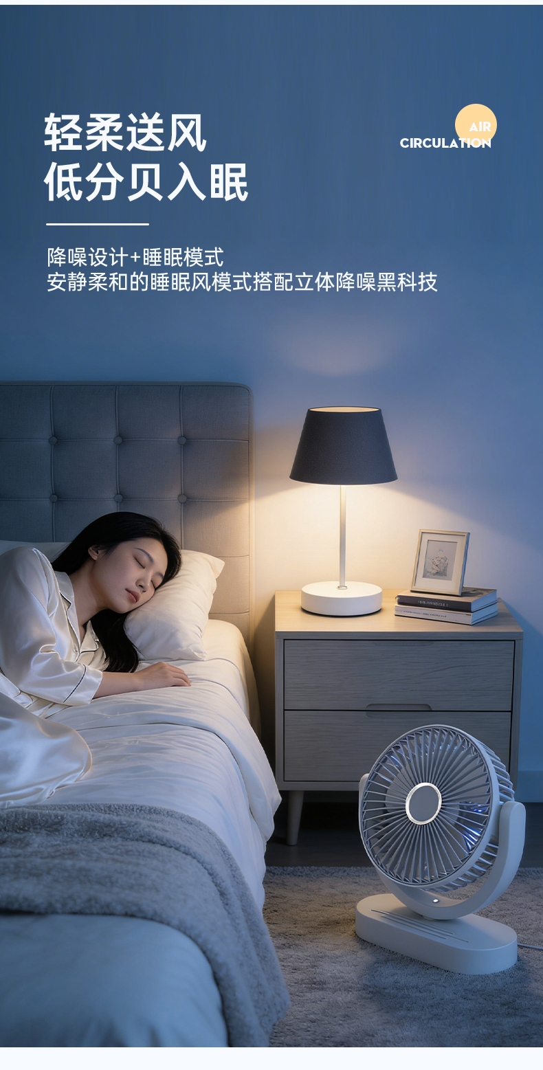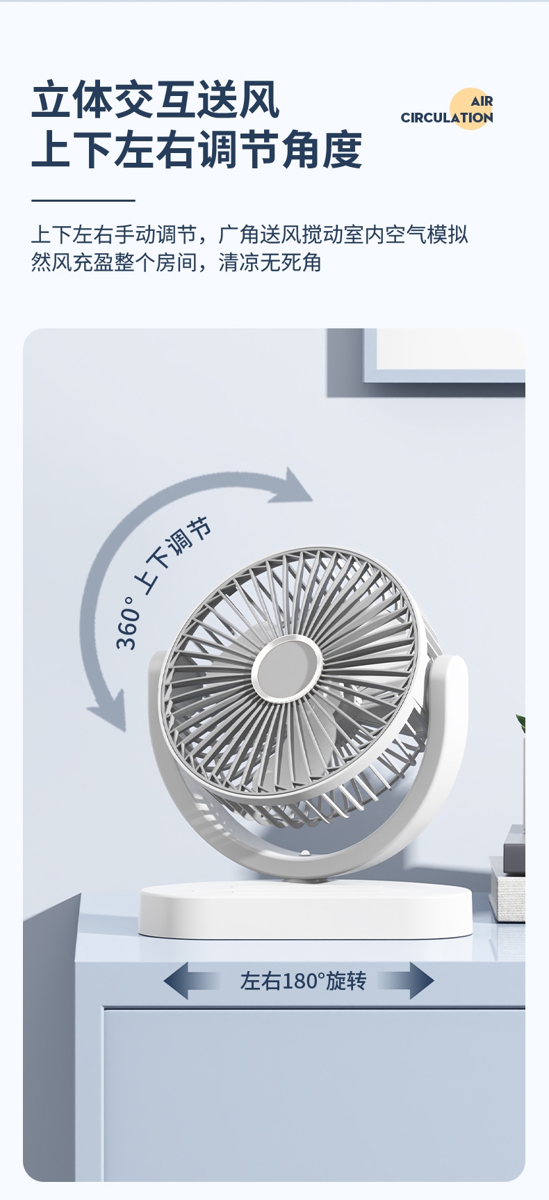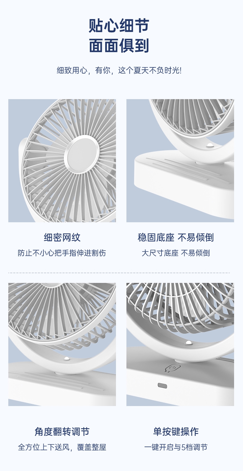 细密网纹 ,防止不小心把手指伸进割伤;稳固底座,不易倾倒;角度翻转调节, 全方位上下送风,覆盖整屋