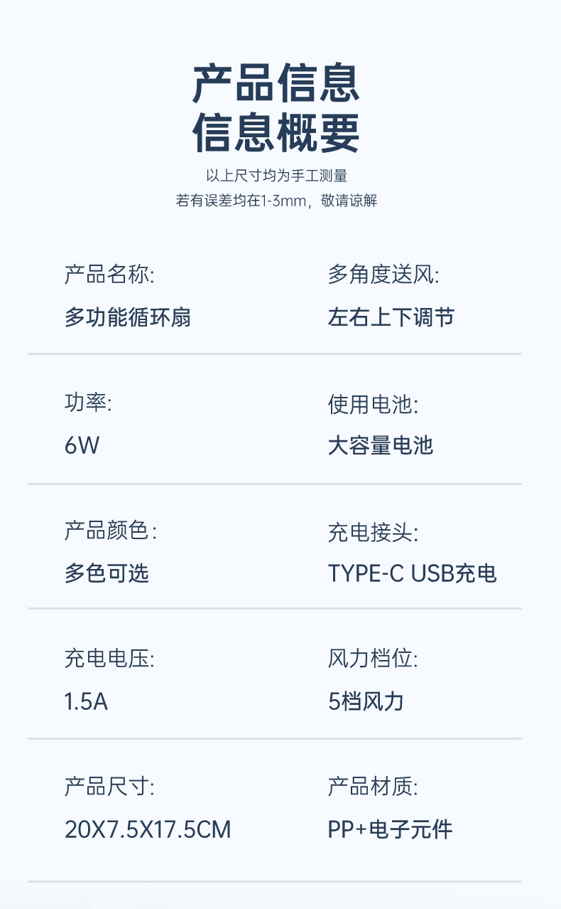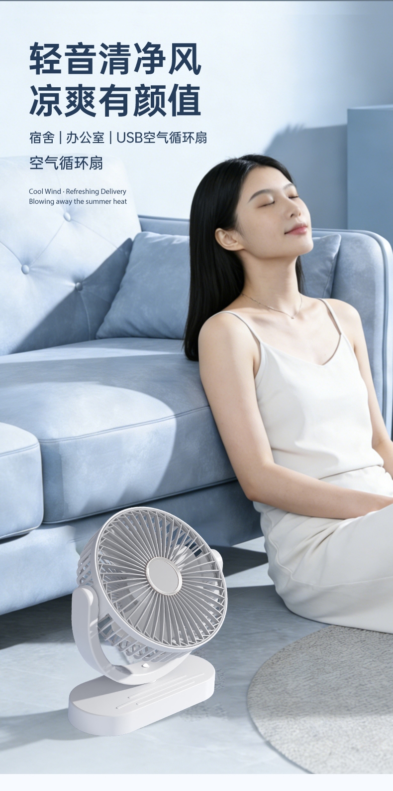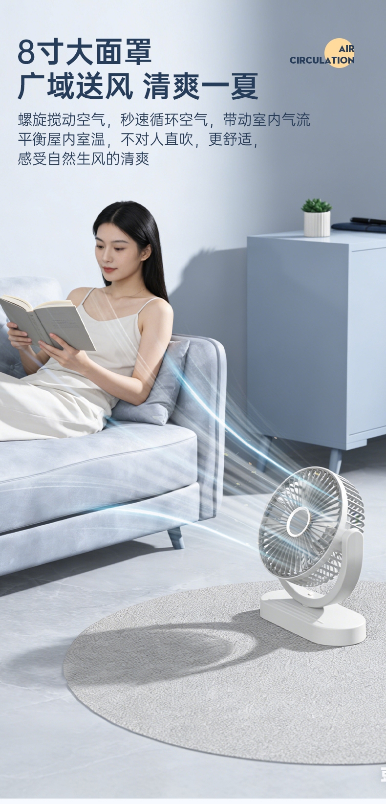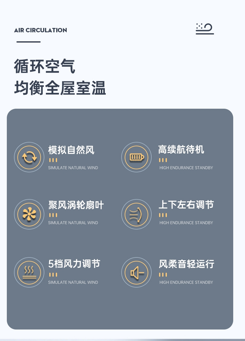 细密网纹 ,防止不小心把手指伸进割伤;稳固底座,不易倾倒;角度翻转调节, 全方位上下送风,覆盖整屋