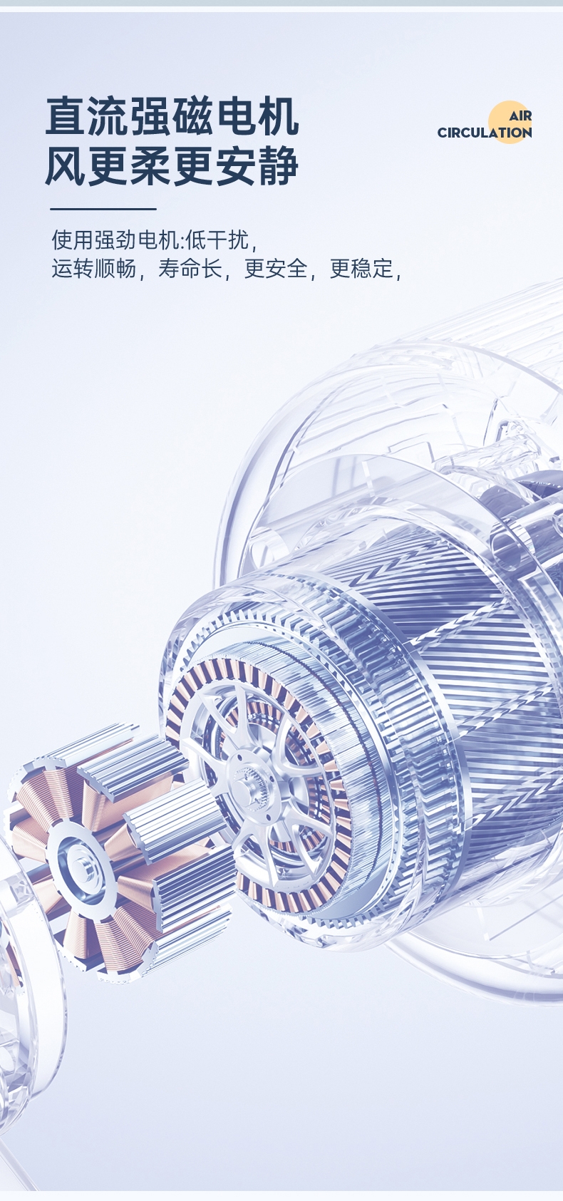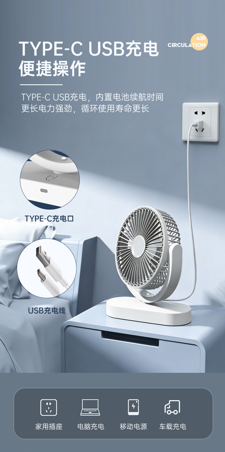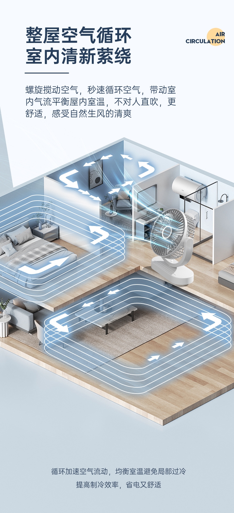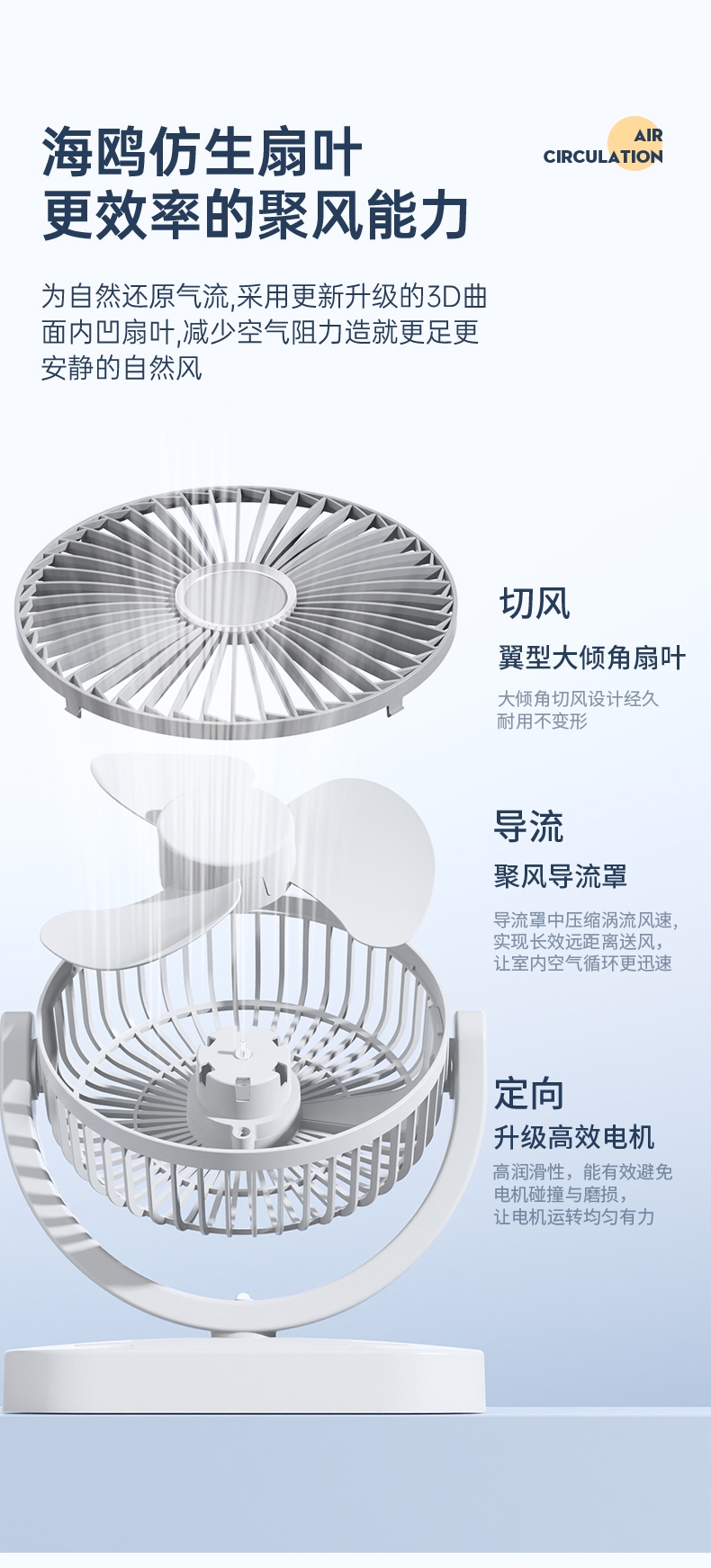细密网纹 ,防止不小心把手指伸进割伤;稳固底座,不易倾倒;角度翻转调节, 全方位上下送风,覆盖整屋