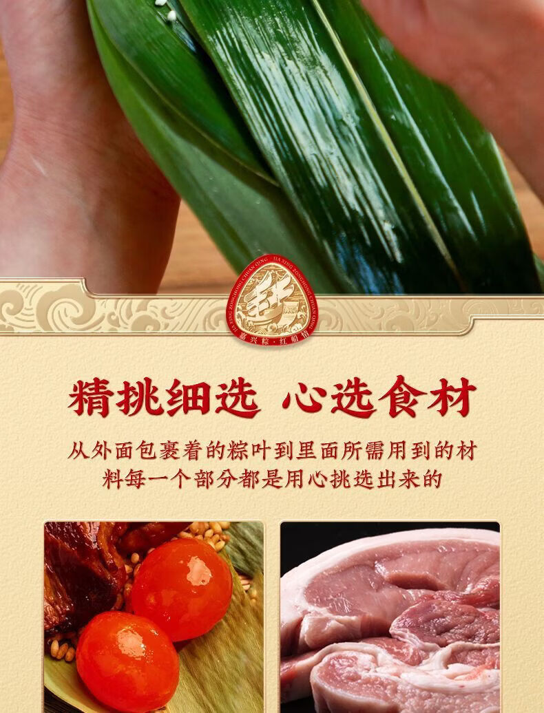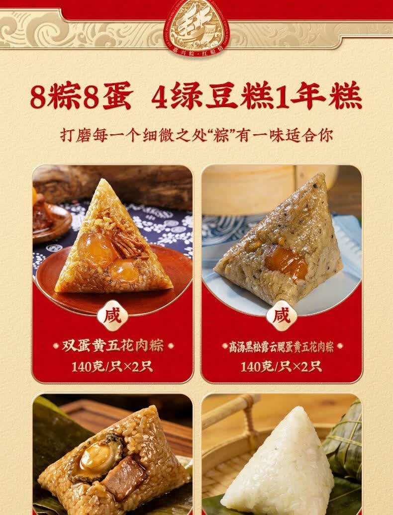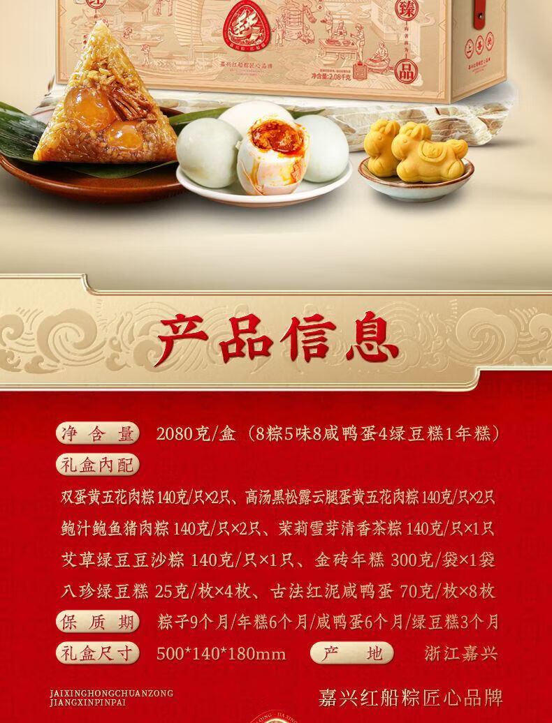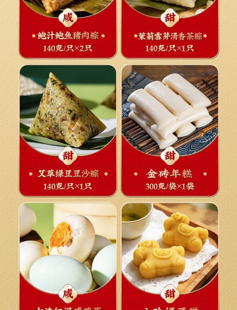 配置:双蛋黄五花肉粽:140克*2袋 高汤黑松露云腿蛋黄五花肉粽:140克*2袋 鲍汁鲍鱼猪肉粽:140克*2袋 茉莉雪芽清香茶粽:140克*1袋 艾草绿豆豆沙粽:140克*1袋 八珍绿豆糕:25克×4枚*1盒 金砖年糕:300克×1只*1袋 古法红泥咸鸭蛋:70克×4枚*2盒
