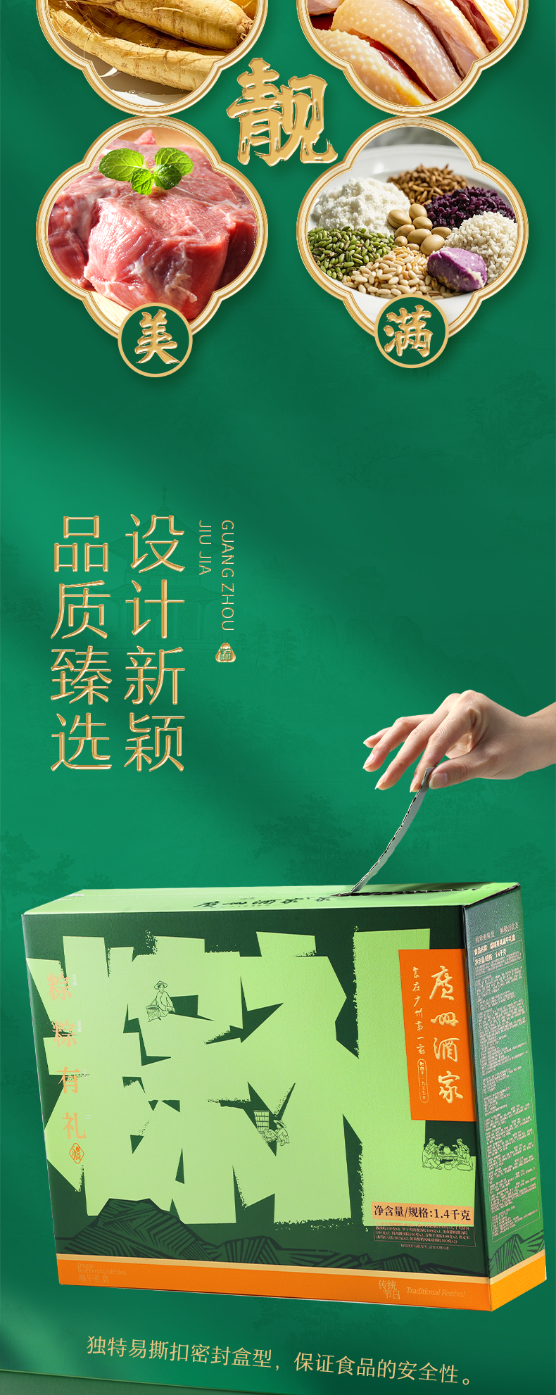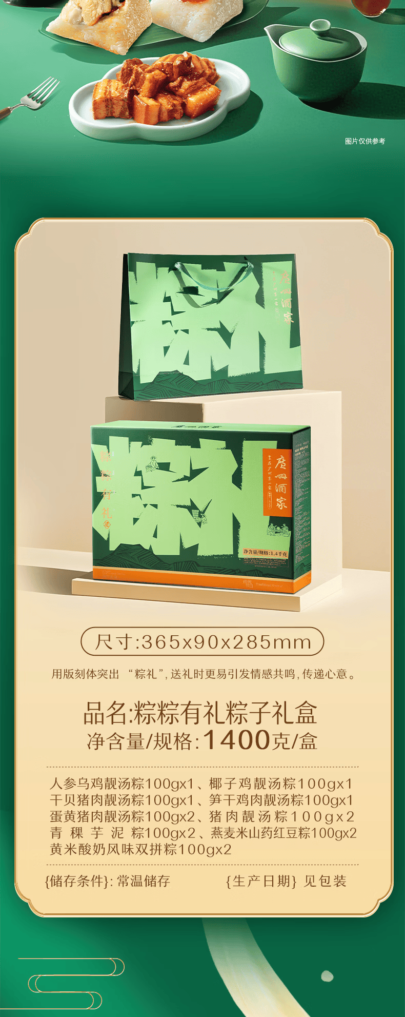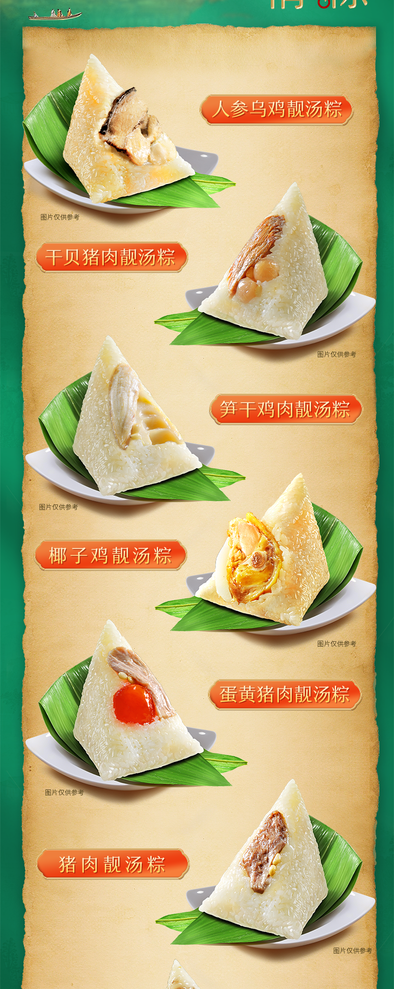 配置:人参乌鸡靓汤粽 100g*1 椰子鸡靓汤粽 100g*1 干贝猪肉靓汤粽 100g*1 笋干鸡肉靓汤粽 100g*1 蛋黄猪 肉靓汤粽 100g*2 猪肉靓汤粽 100g*2 青稞芋泥粽 100g*2 燕麦米山药红豆粽 100g*2 黄米酸奶风味双拼粽 100g*2