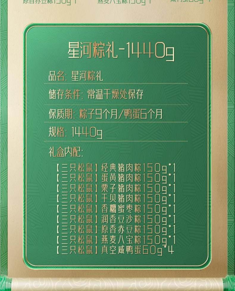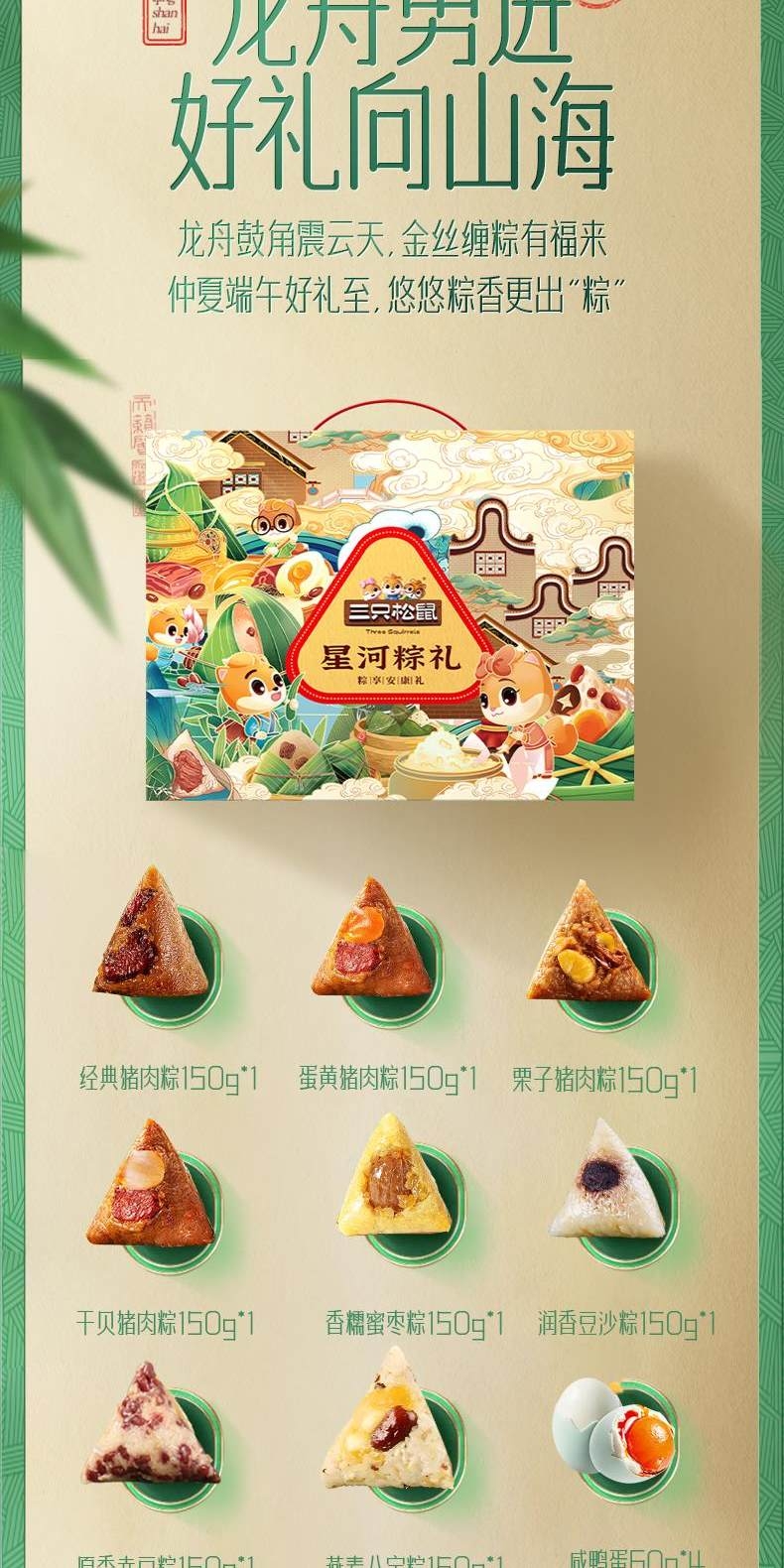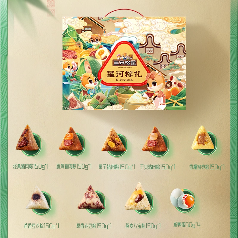 配置:【三只松鼠】经典猪肉粽 150g*1 【三只松鼠】蛋黄猪肉粽 150g*1 【三只松鼠】栗子猪肉粽 150g*1 【三只松鼠】干贝猪肉粽 150g*1 【三只松鼠】香糯蜜枣粽 150g*1 【三只松鼠】润香豆沙粽 150g*1 【三只松鼠】原香赤豆粽 150g*1 【三只松鼠】燕麦八宝粽 150g*1 【三只松鼠】真空咸鸭蛋 60g*4